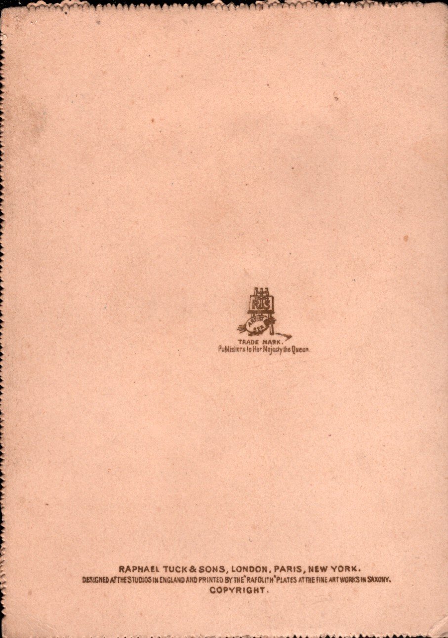 back:-logo over TRADE MARK -- with or without PUBLISHERS BY SPECIAL APPOINTMENT, with or without PUBLISHERS BY APPOINTMENT TO HER MAJESTY THE QUEEN -- RAPHAEL TUCK & SONS LTD -- LONDON, PARIS, NEW YORK -- DESIGNED AT THE STUDIOS IN ENGLAND AND PRINTED BY THE "RAFOLITH" PLATES IN SAXONY -- COPYRIGHT
