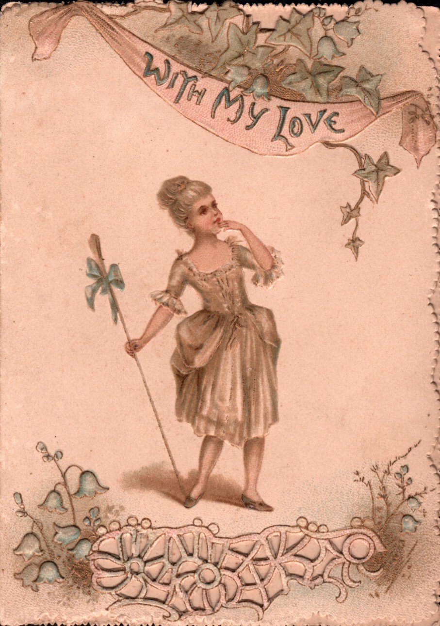 WITH MY LOVE woman in white stands facing right holding wand, fingers to lips, flowers around