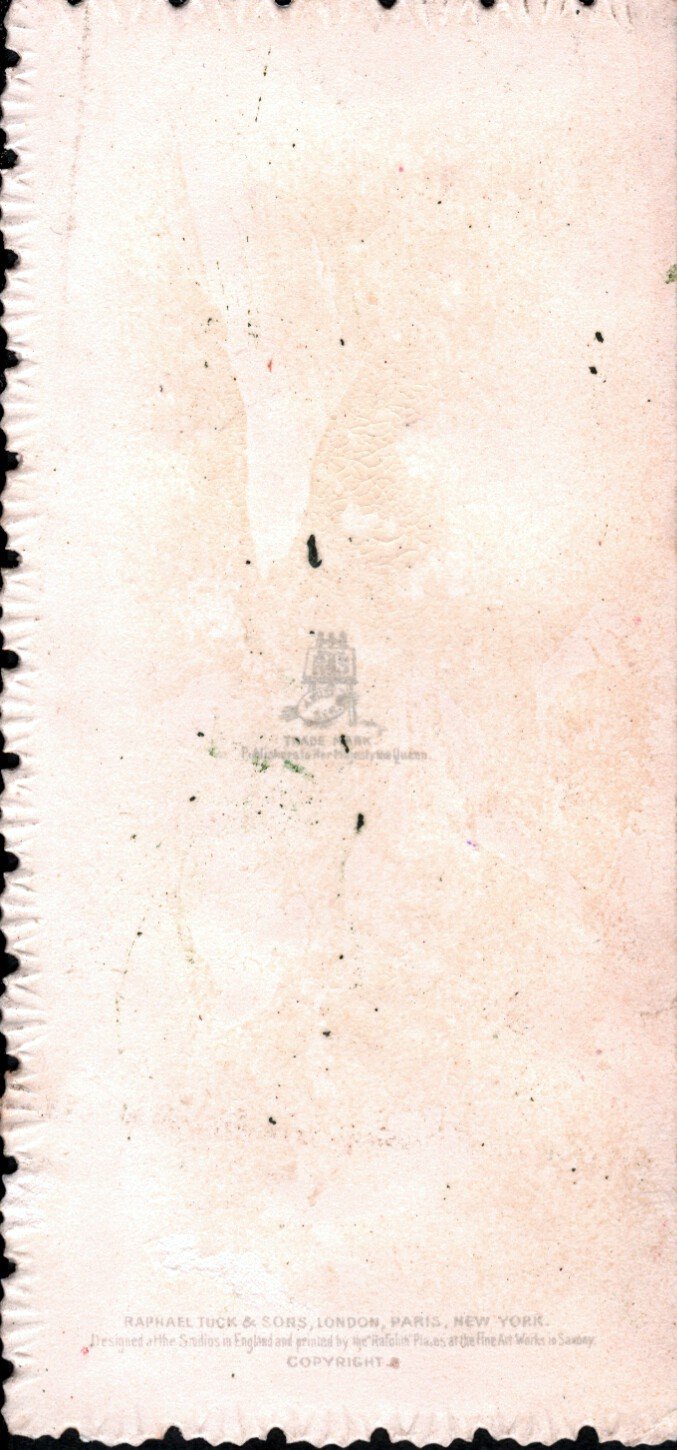 back:-logo over TRADE MARK -- with or without PUBLISHERS BY SPECIAL APPOINTMENT, with or without PUBLISHERS BY APPOINTMENT TO HER MAJESTY THE QUEEN -- RAPHAEL TUCK & SONS LTD -- LONDON, PARIS, NEW YORK -- DESIGNED AT THE STUDIOS IN ENGLAND AND PRINTED BY THE "RAFOLITH" PLATES IN SAXONY -- COPYRIGHT