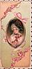 head & shoulders study of woman with hat & red roses in oval gilt frame, pink ribbon, pink blossom below