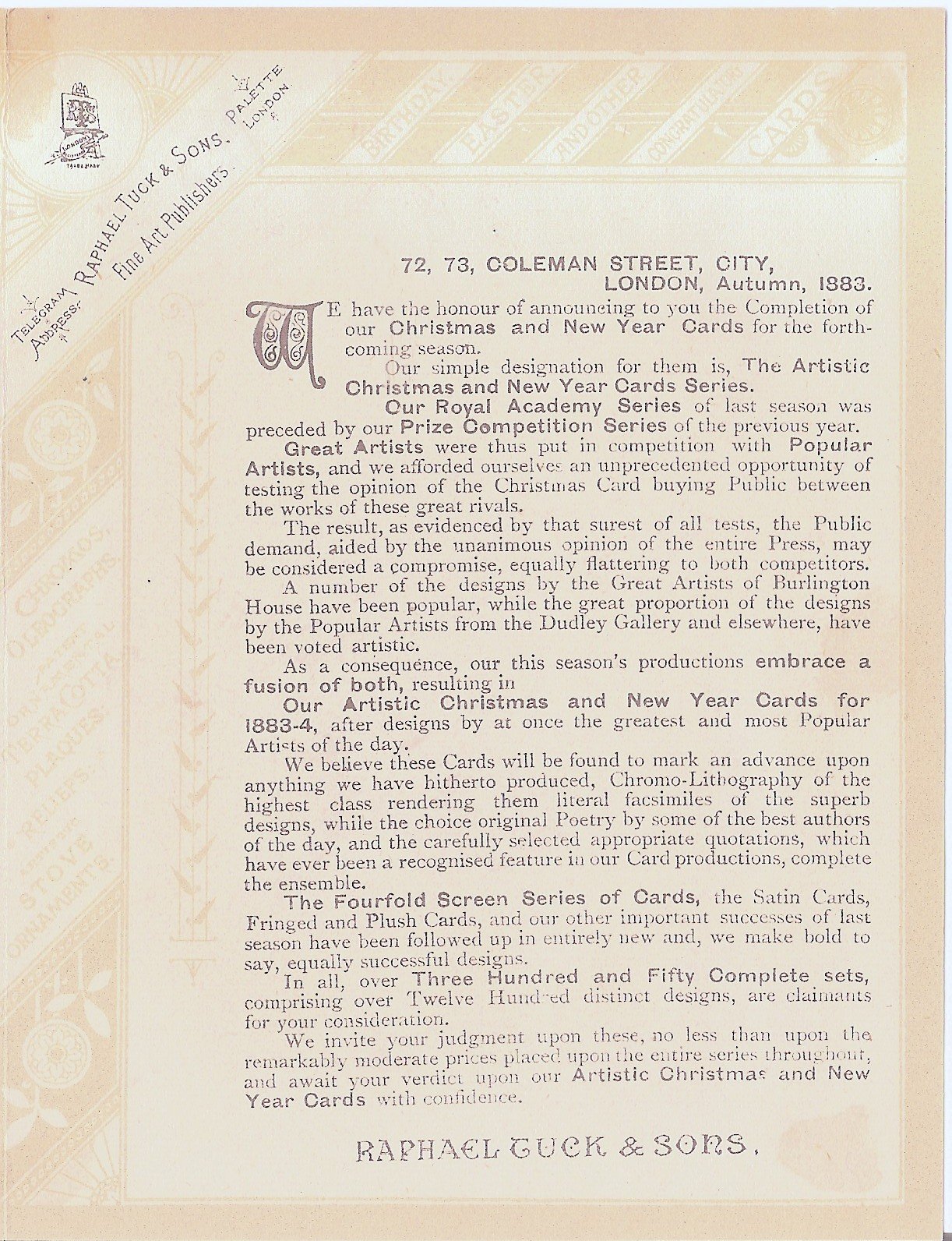 RAPHAEL TUCK & SONS' CHRISTMAS NEW YEAR CARDS SEASON 1883 & 1884 advert card