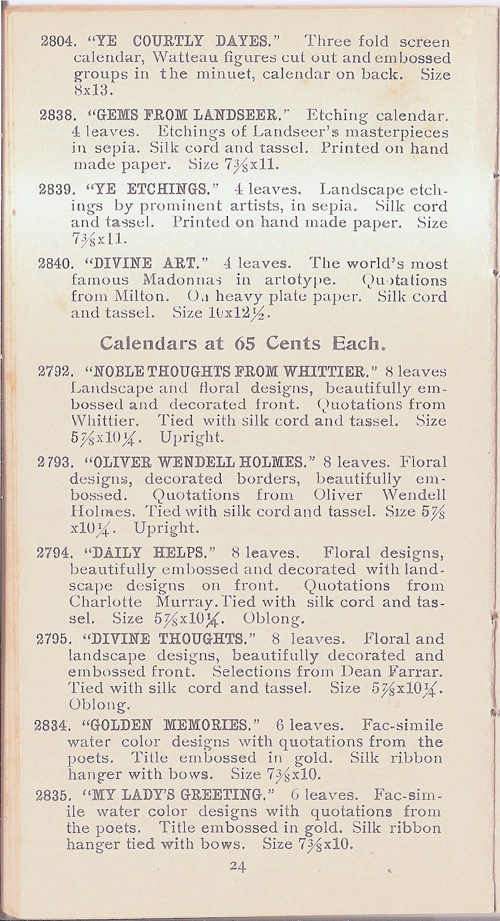 YE COURTLY DAYES - GEMS FROM LANDSEER - YE ETCHINGS - DIVINE ART - NOBLE THOUGHTS FROM WHITTIER - OLIVER WENDELL HOLMES - DAILY HELPS - DIVINE THOUGHTS - GOLDEN MEMORIES - MY LADY'S GREETING