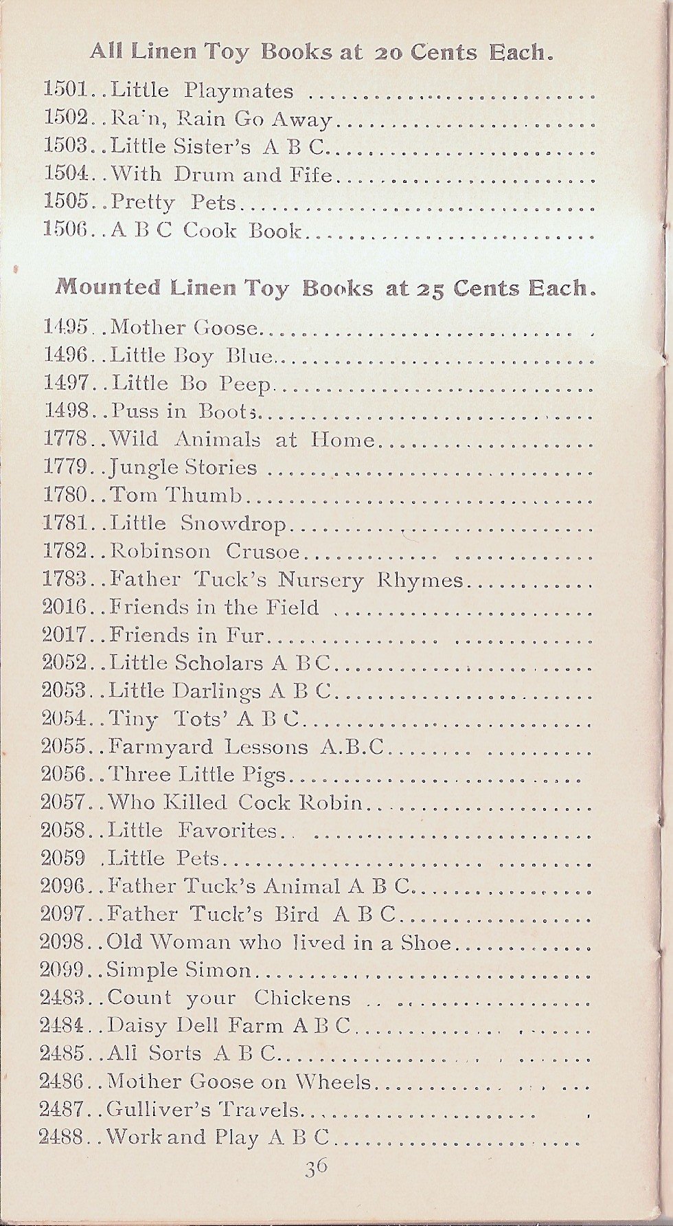 ALL LINEN TOY BOOKS AT 20 CENTS EACH - MOUNTED LINEN TOY BOOKS AT 25 CENTS EACH