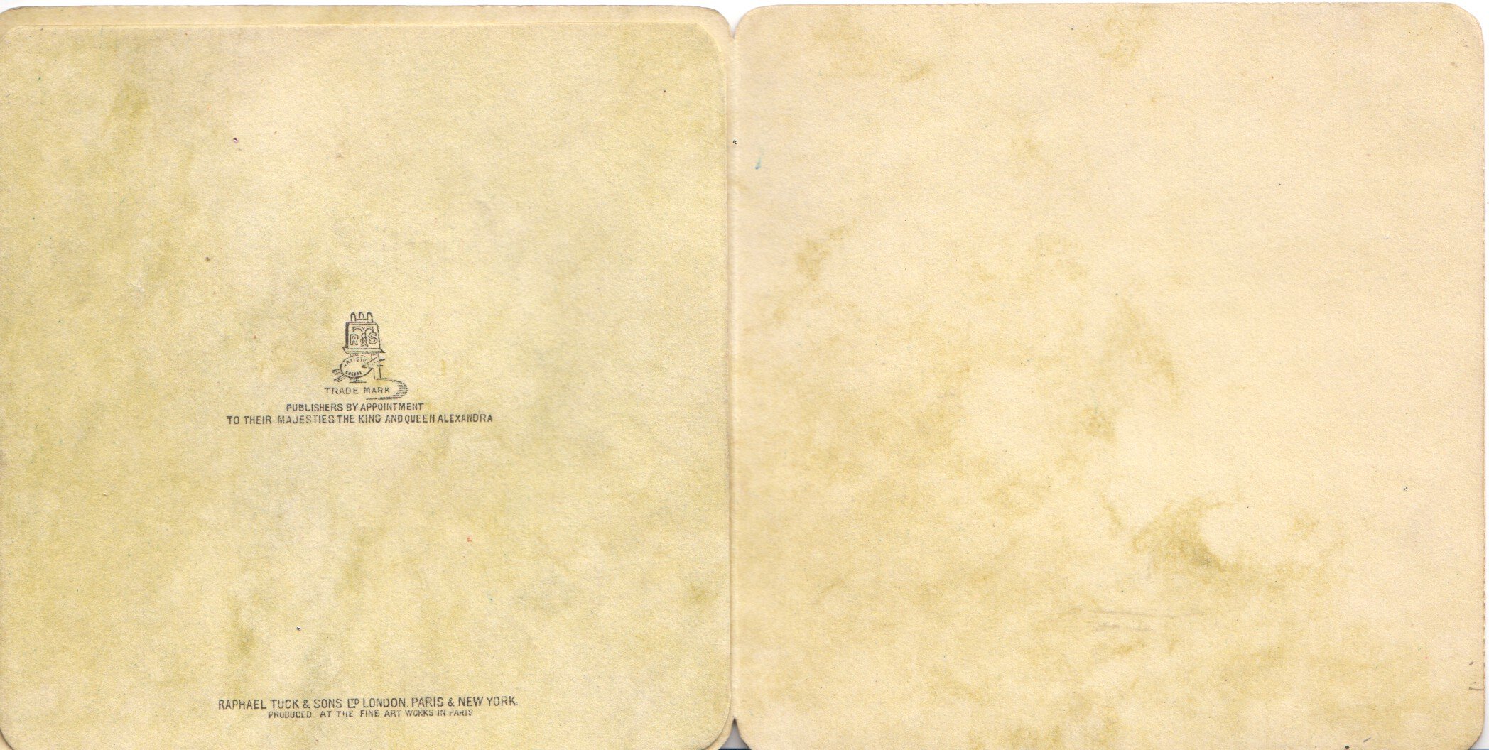 logo over TRADE MARK --PUBLISHERS BY APPOINTMENT-- PUBLISHERS TO THEIR MAJESTIES THE KING AND QUEEN ALEXANDRA -- RAPHAEL TUCK & SONS LTD -- LONDON ; PARIS ; NEW YORK -- PRODUCED AT THE FINE ART WORKS IN PARIS,