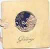 square with rounded corners cover & single sheet, single folded, secured by ribbon, to give left & right flaps, embossed inside first right:-THE FELLOWSHIP OF KINDRED HEARTS IS SWEET, BUT YULETIDE'S CHARM DOTH MAKE IT SWEETER STILL second right:-GREETING AND BEST WISHES FOR A HAPPY CHRISTMAS FROM