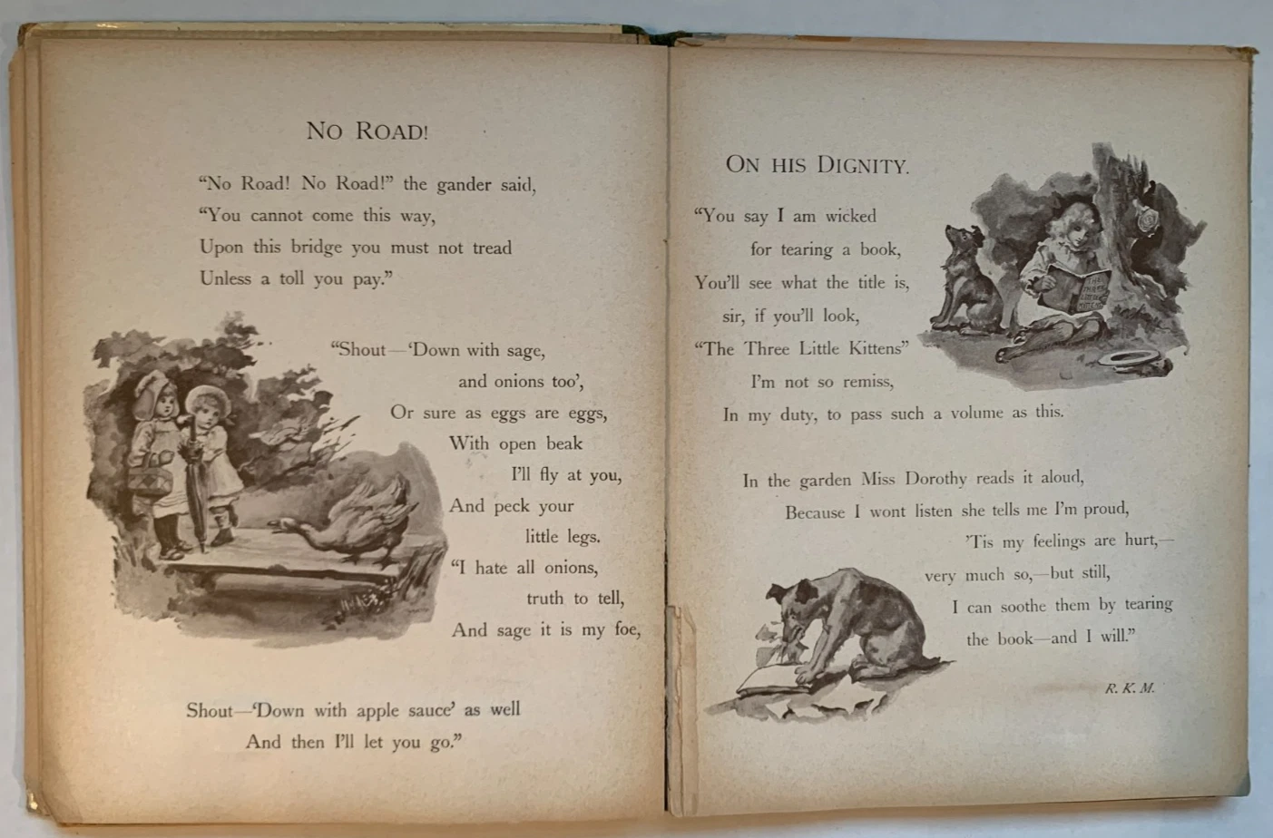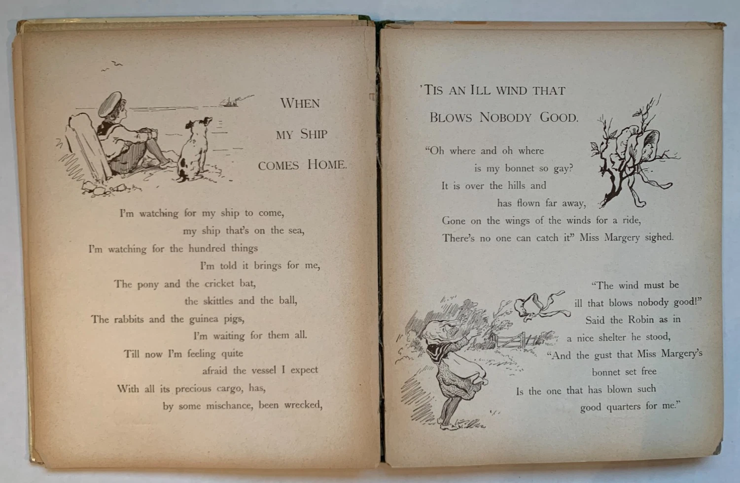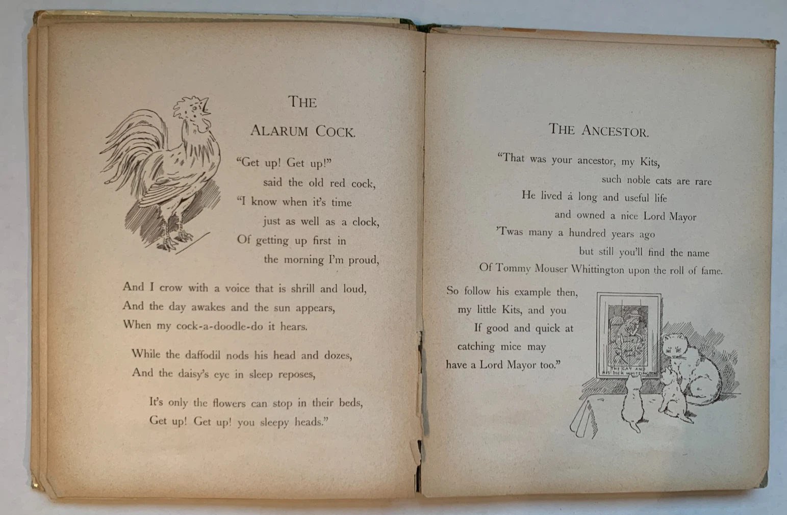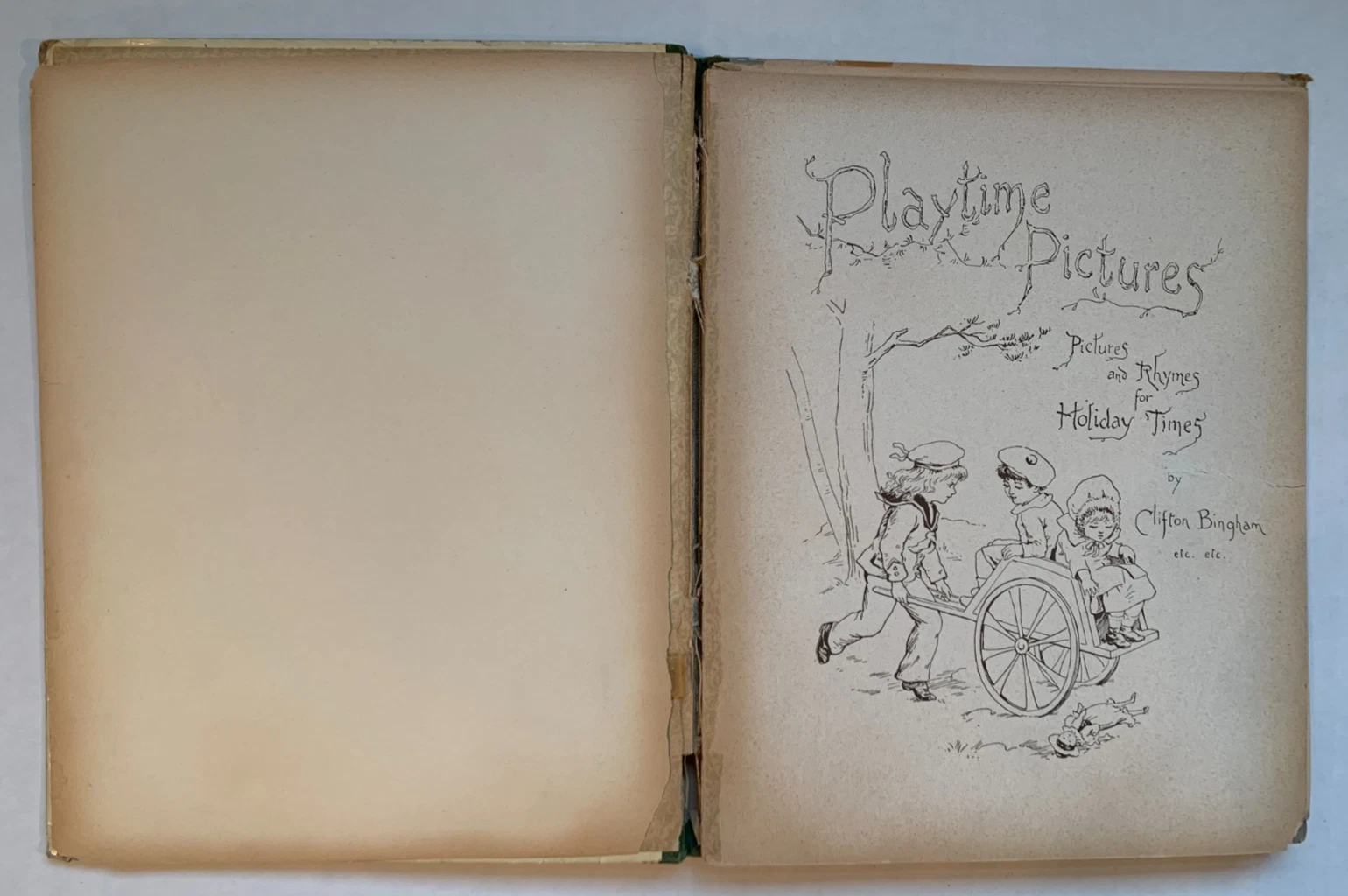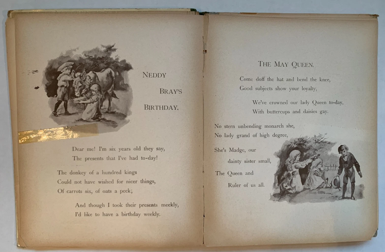 PICTURES AND RHYMES FOR HOLIDAY TIMES, pictorial board covers with green cloth spine binding , cream colored background, 26 pages with four two page pop ups, circa 1895, RAPHAEL TUCK & SONS, LONDON-PARIS-NEW YORK. PUBLISHERS TO THE QUEEN. DESIGNED AT THE STUDIOS IN ENGLAND. PRINTED AT THE FINE ART WORKS IN SAXONY
