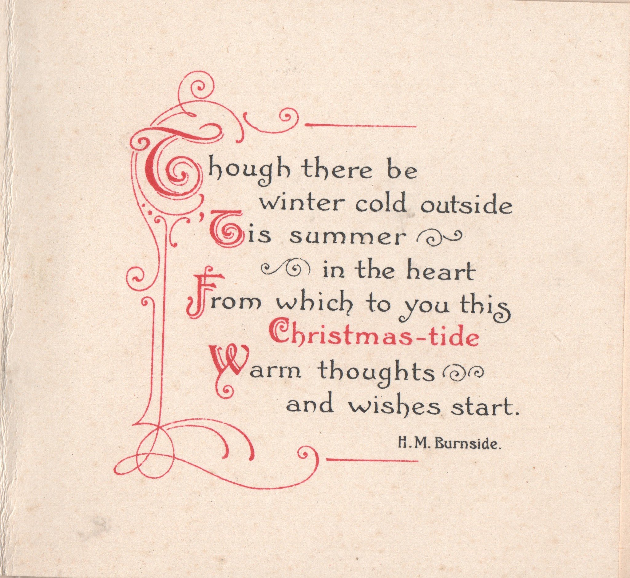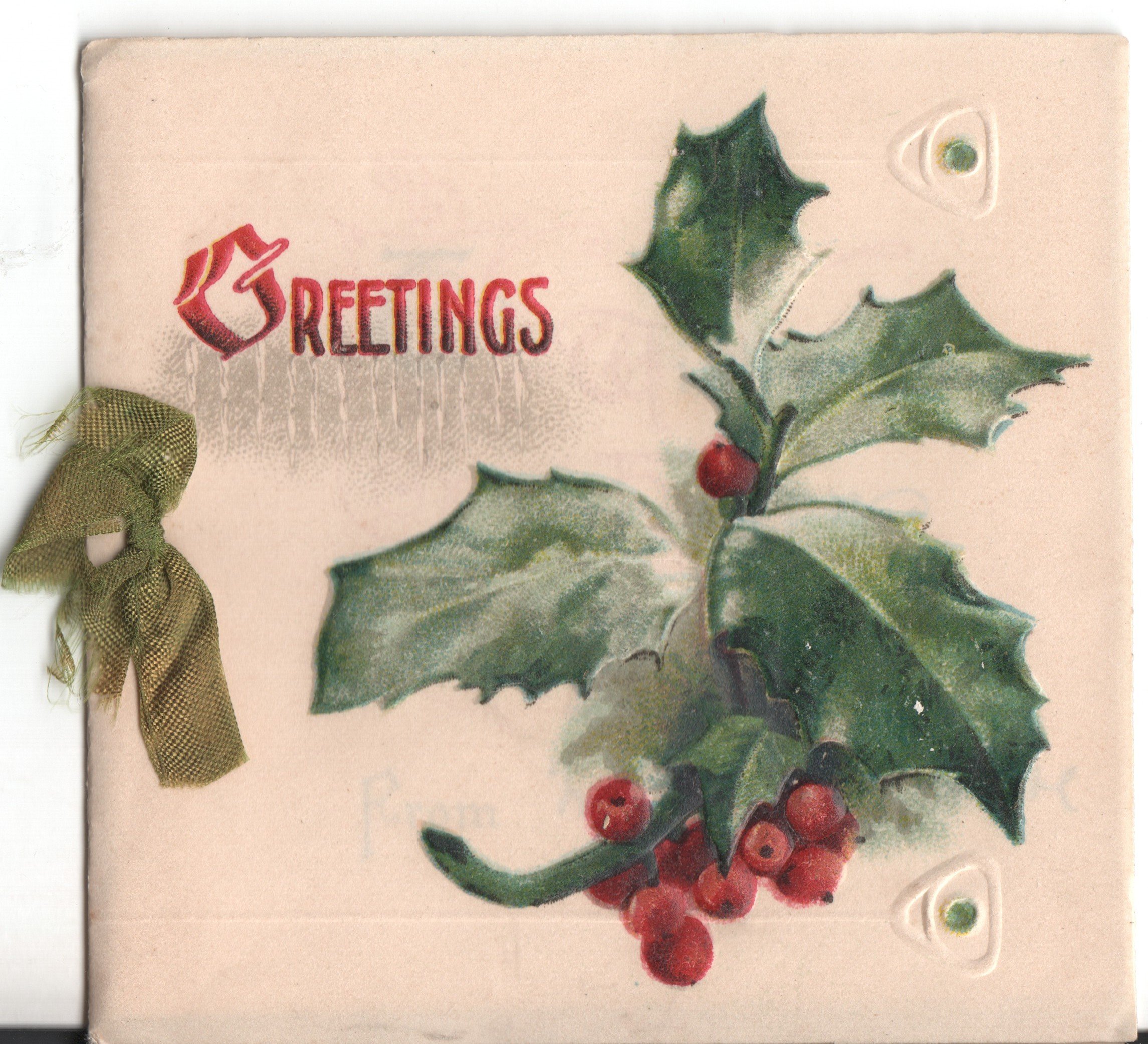 cover & sheet,single folds secured by ribbon, embossed, inset berried holly inside first right:- TO WISH YOU A HAPPY CHRISTMAS FROM second:-THOUGH THERE BE WINTER COLD OUTSIDE 'TIS SUMMER IN THE HEART FROM WHICH TO YOU THIS CHRISTMAS-TIDE WARM THOUGHTS AND WISHES START