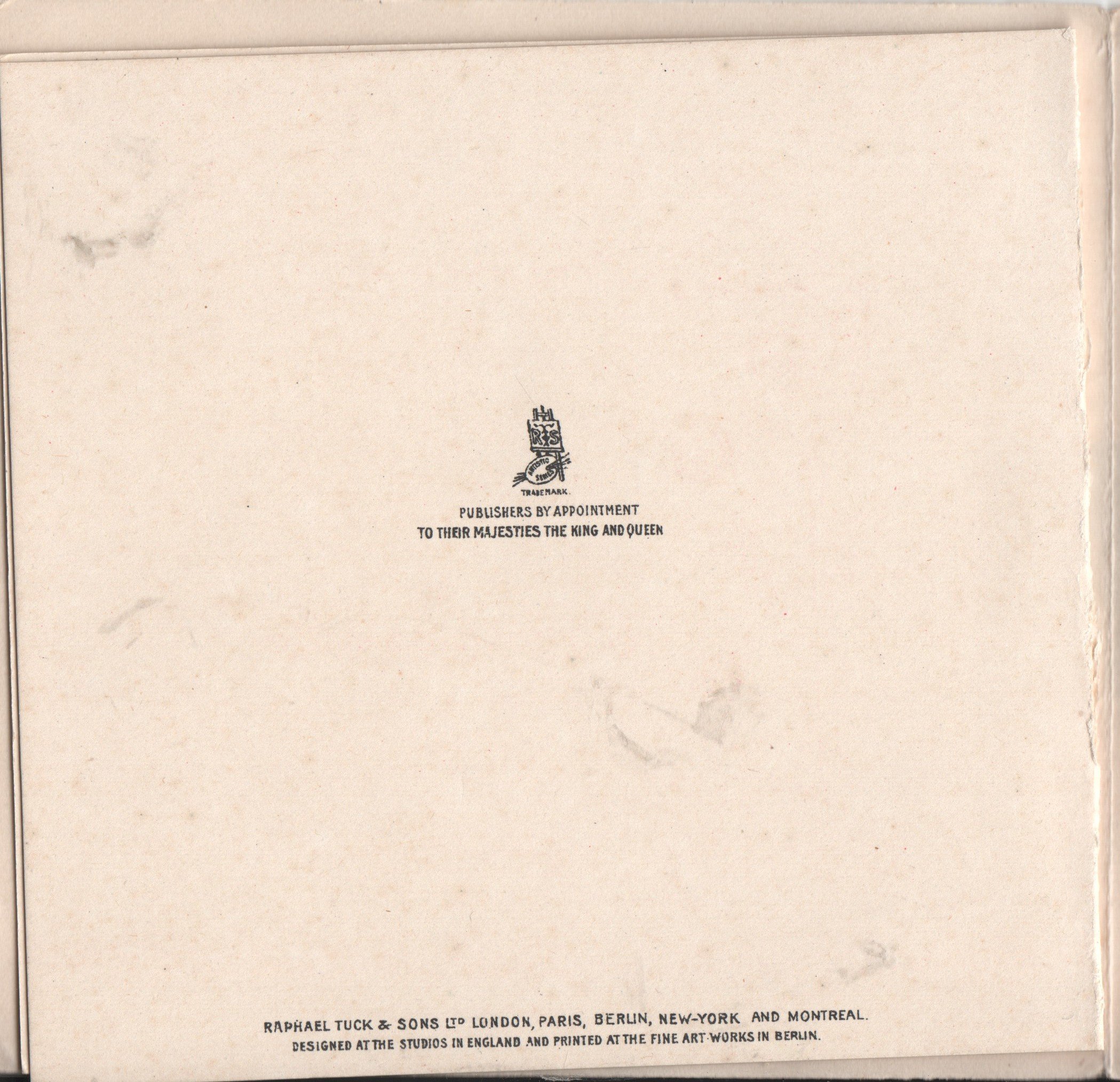 logo over RAPHAEL TUCK & SONS LTD -- PUBLISHERS BY APPOINTMENT TO THEIR MAJESTIES THE KING AND QUEEN -- LONDON, PARIS, BERLIN, NEW YORK;with or w/o MONTREAL --DESIGNED AT THE STUDIOS IN ENGLAND AND PRINTED AT THE FINE ART WORKS IN BERLIN