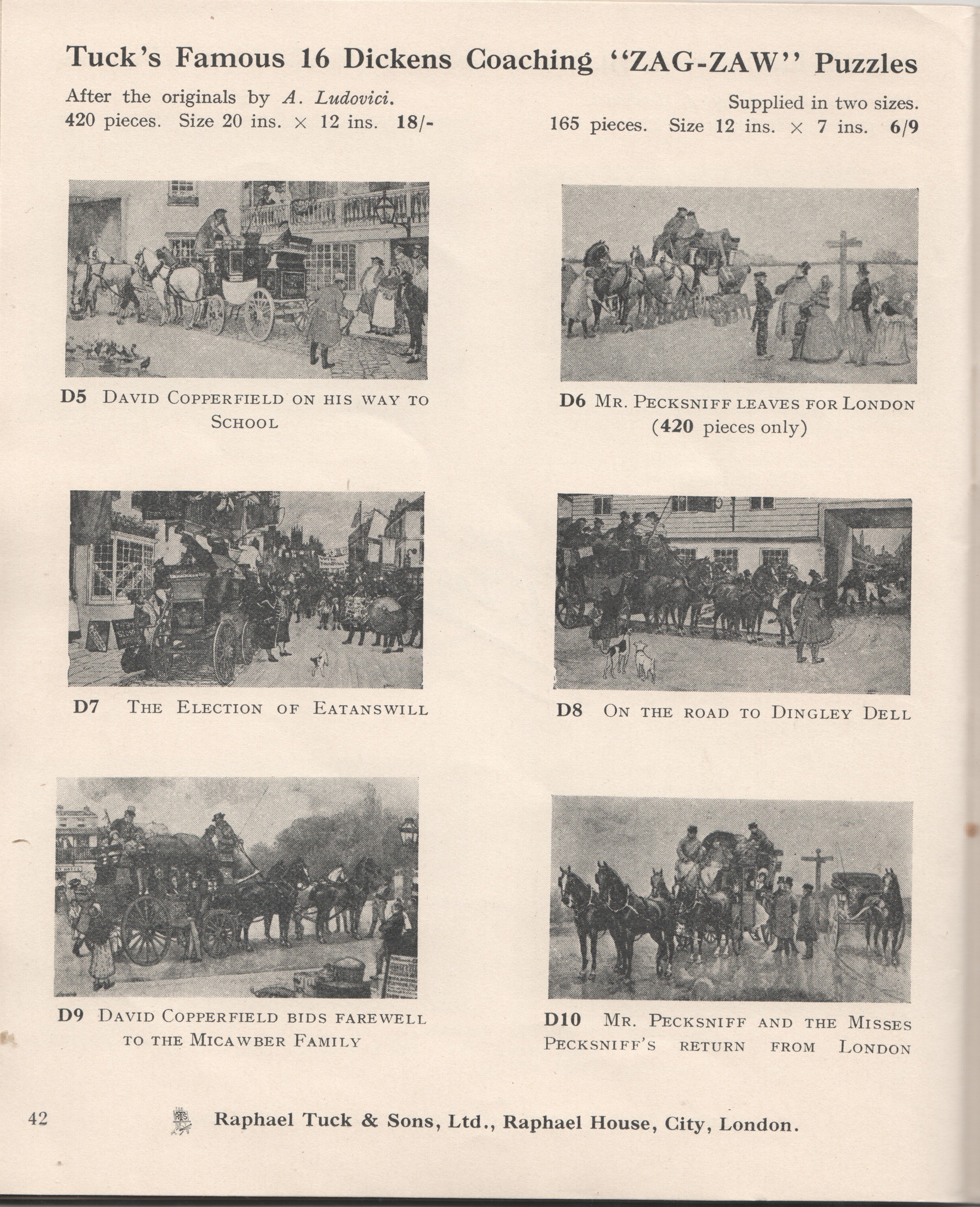 AFTER THE ORIGINALS BY A. LUDOVICI. 420 PIECES. SIZE 20 INS X 12 INS. 18/- SUPPLIED IN TWO SIZES. 165 PIECES. SIZE 12 INS. X 7 INS. 6/9 D5 DAVID COPPERFIELD ON HIS WAY TO SCHOOL D6 MR. PECKSNIFF LEAVES FOR LONDON (420 PIECES ONLY) D7 THE ELECTION OF EATANSWILL D8 ON THE ROAD TO DINGLEY DELL D9 DAVID COPPERFIELD BIDS FAREWELL TO THE MICAWBER FAMILY D10 MR. PECKSNIFF AND THE MISSES PECKSNIFF'S RETURN FROM LONDON
