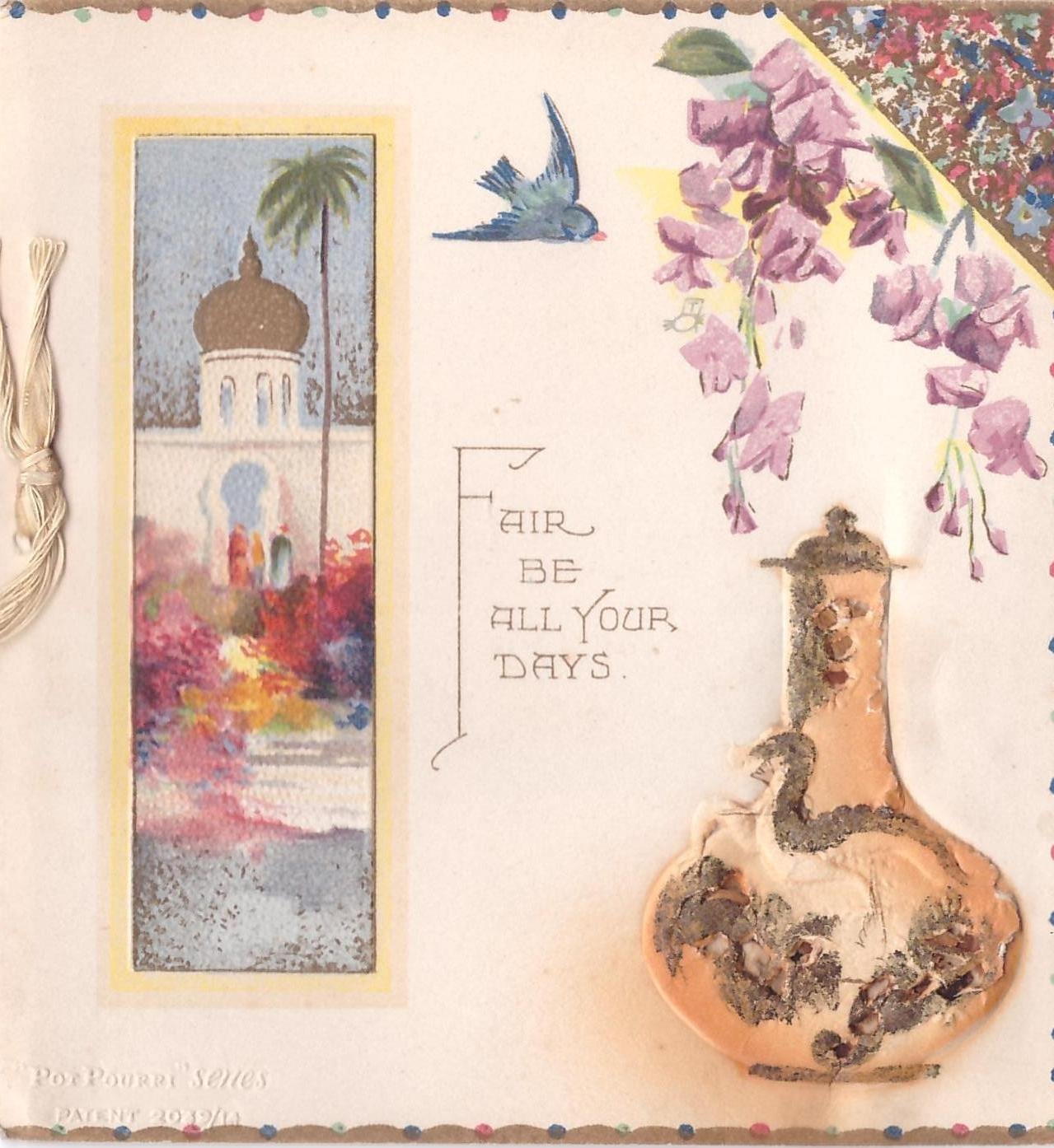 FAIR BE ALL YOUR DAYS between vase with enclosed pot pourri & inset temple, hanging purple flowers & bluebird top right