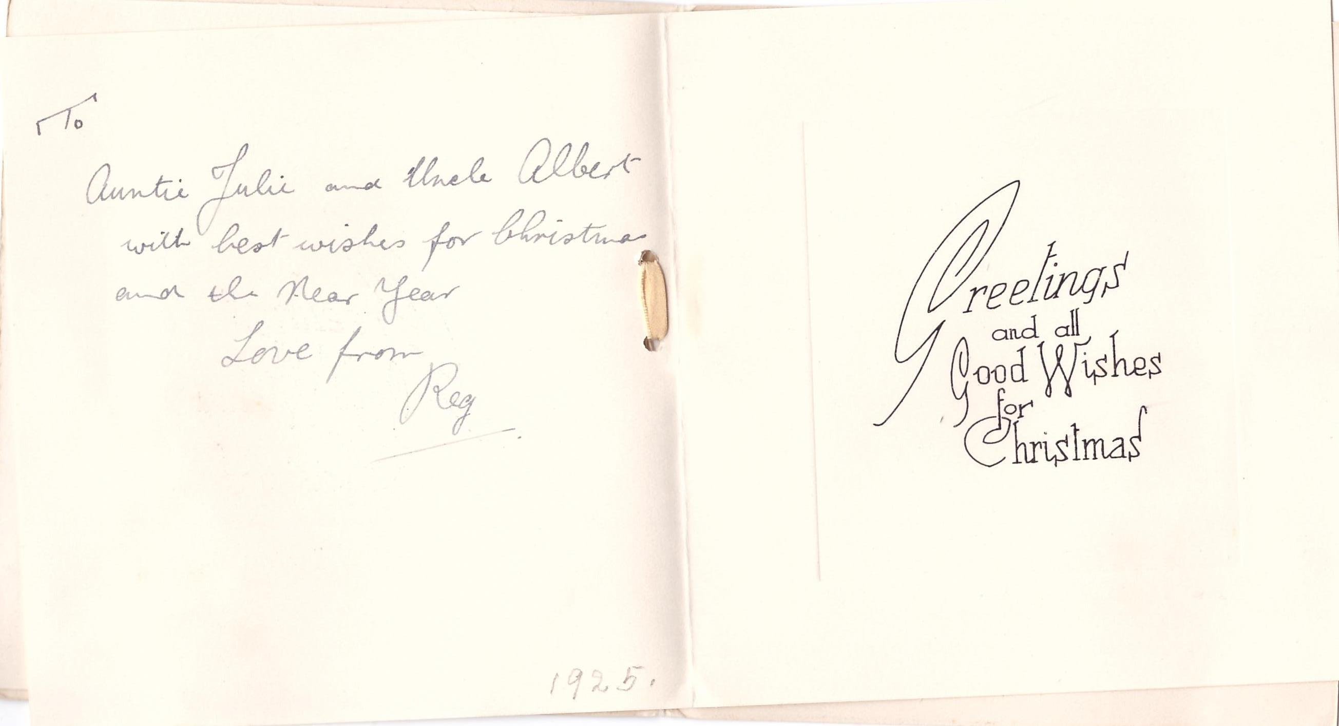 inner sheet right: GREETINGS AND ALL GOOD WISHES FOR CHRISTMAS date used: 1925