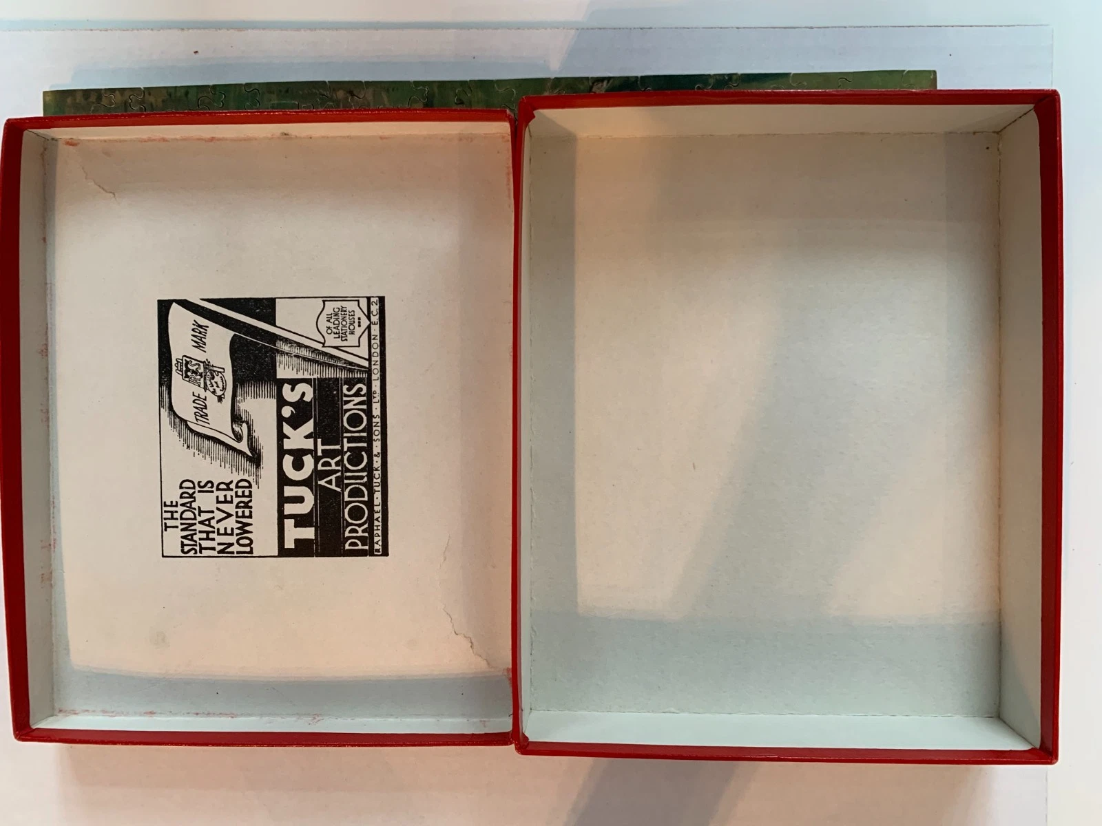 Zag-Zaw line of puzzles was first produced in 1909, most incorporate figurals or whimsies, sold in red, orange, or occasionally green boxes with labels on the side or bottom of the box, most without guide pictures. Initially cut non-interlocking but by 1930's became more so. Puzzles have a different cuts so that the same image will come in several versions which means that missing pieces can not be taken from other puzzles with the same image. The puzzle labels are often hand written and come with minor variations in titles and details. Some have a DESIGN category on the label. From my readings this refers to the style of cut, wavy lines, figurals, etc. See also Bob Armstrong's website on old jigsaw puzzles