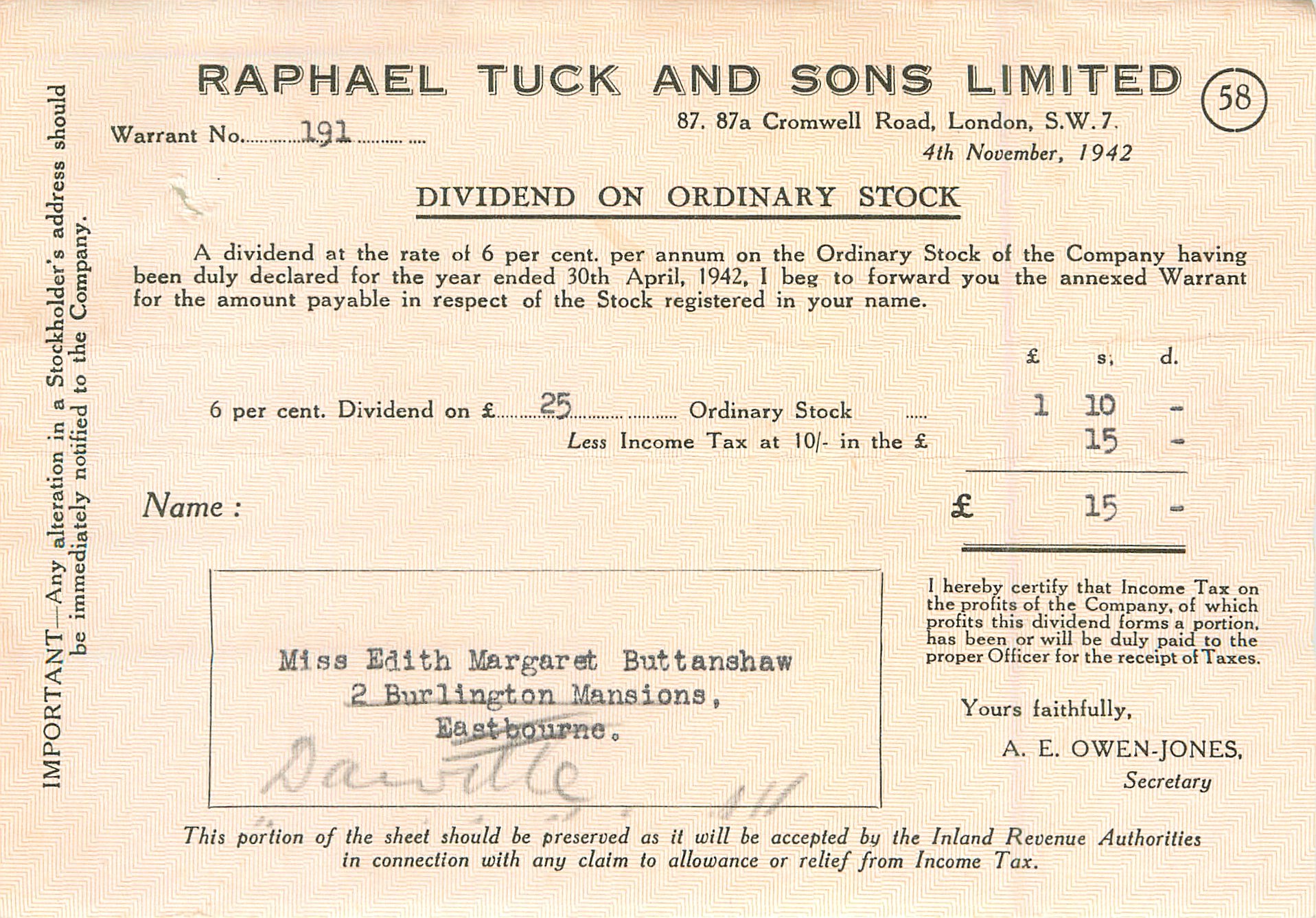 RAPHAEL TUCK & SONS, LIMITED dividend certificate