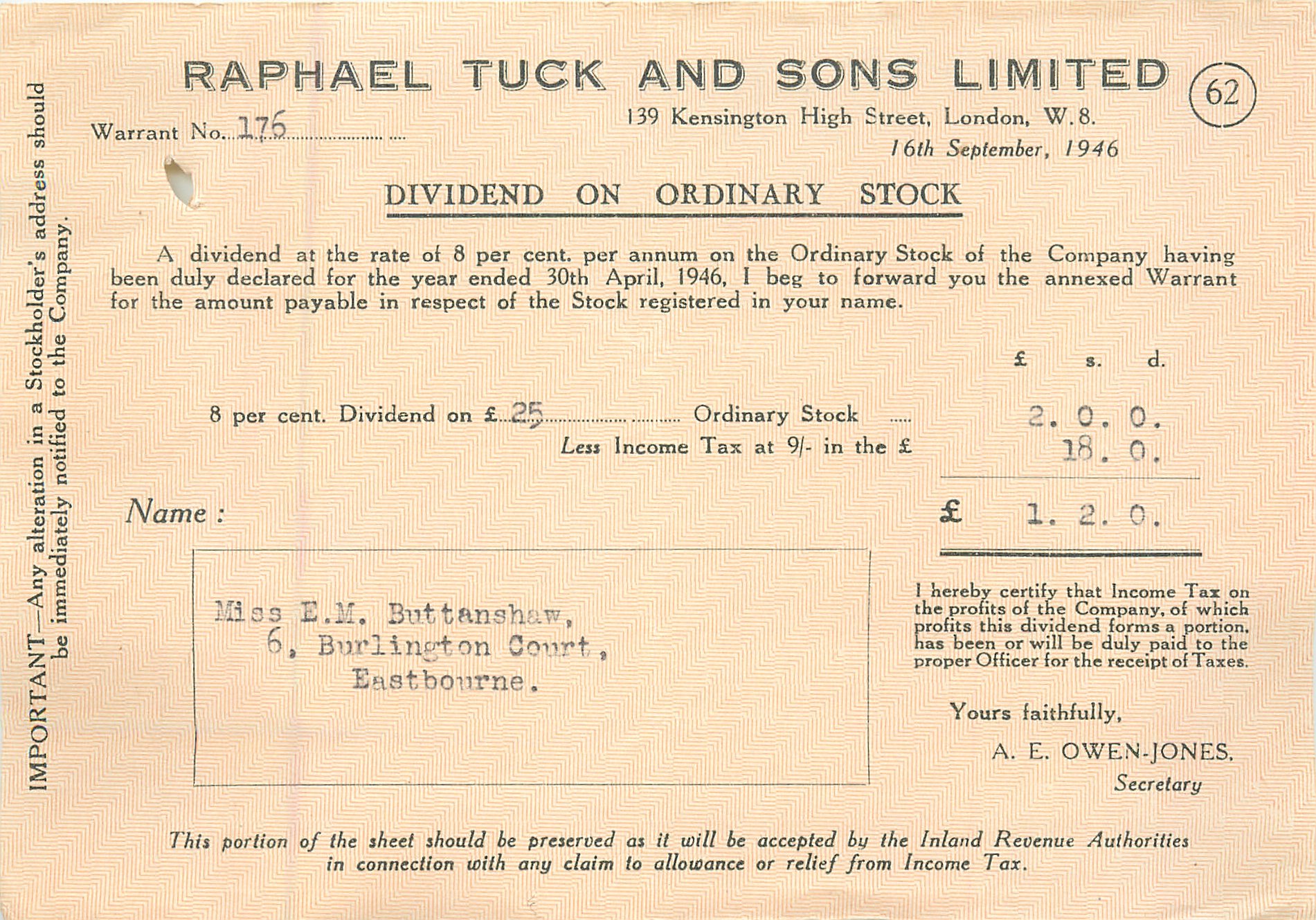 DIVIDEND ON ORDINARY STOCK, 16TH.SEPTEMBER, 1946, WARRANT NO. 176
