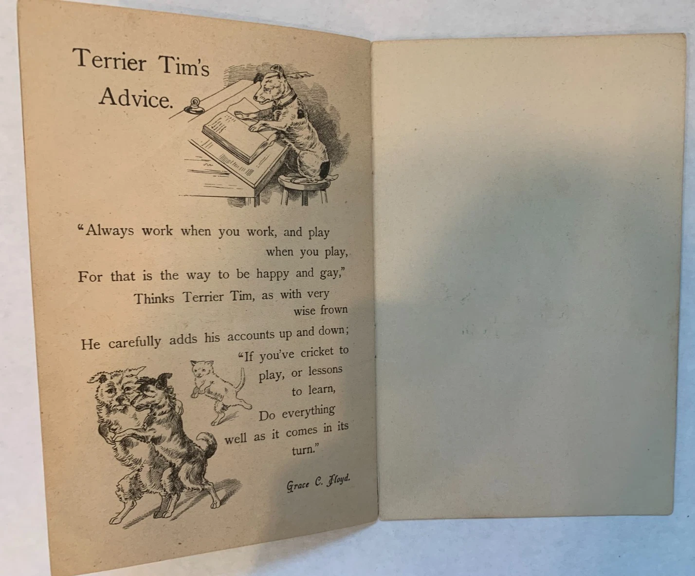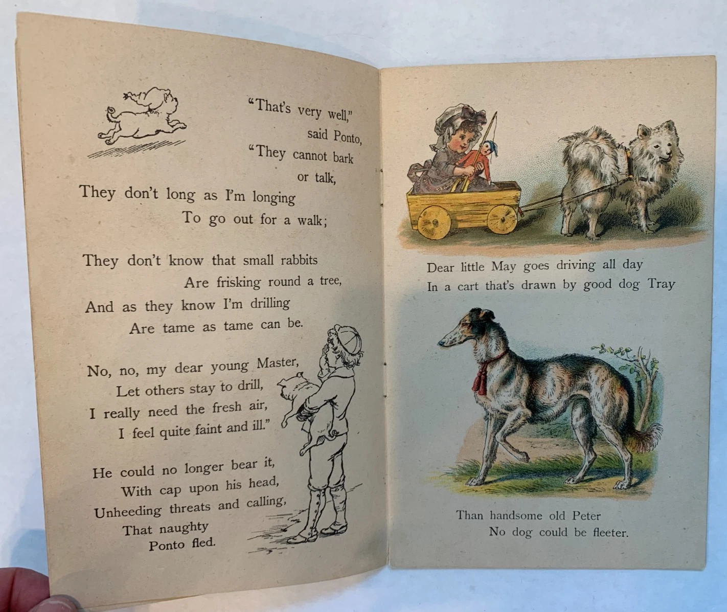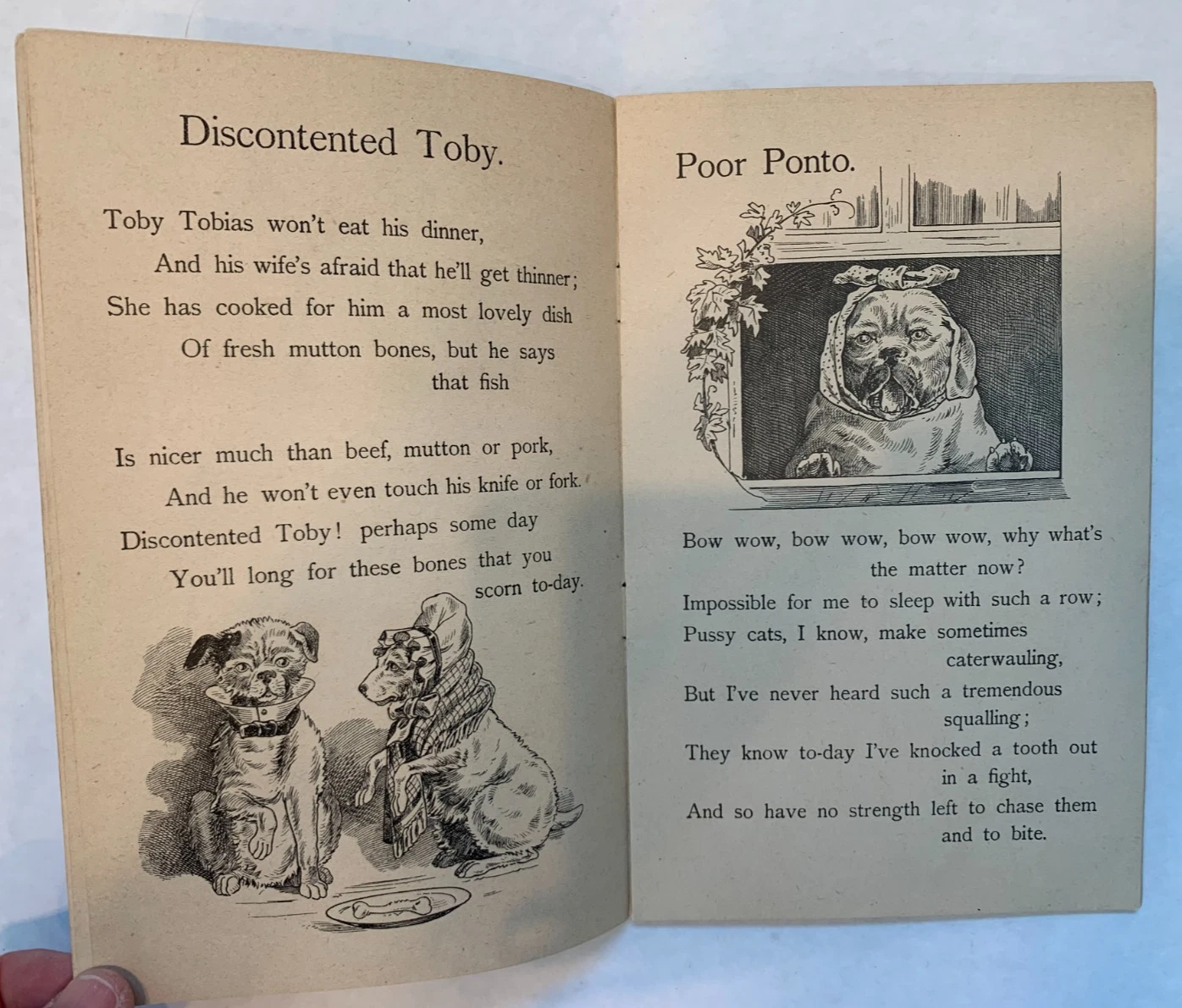 pug dog wearing blue collar with bells, includes poems DEAR DOGGIE, DISCONTENTED TOBY, POOR PRONTO, A BIRTHDAY PRESENT, ON THE SEA, THE FLUTTERBY, COMRADES, AND TERRIER TIM'S ADVICE