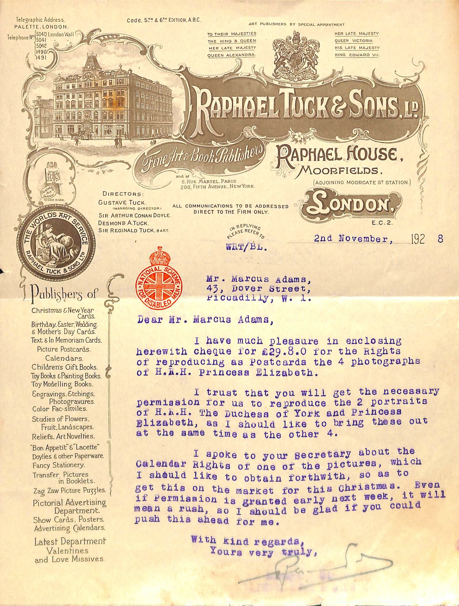 five are signed by Gustave Tuck, three by Desmond A. Tuck and one by Sir Reginald Tuck (the three men being named on the letterhead, together with Sir Arthur Conan Doyle, as the company's directors). Four are addressed to Adams personally, four to his firm (with one for the attention of 'Miss Dorothy Clarke'), and one to Bertram Adams, another royal photographer, with whom Adams shared premises at 43 Dover Street, Mayfair. The ornate letterhead, printed in brown, carries royal warrants and an engraving of Raphael House.