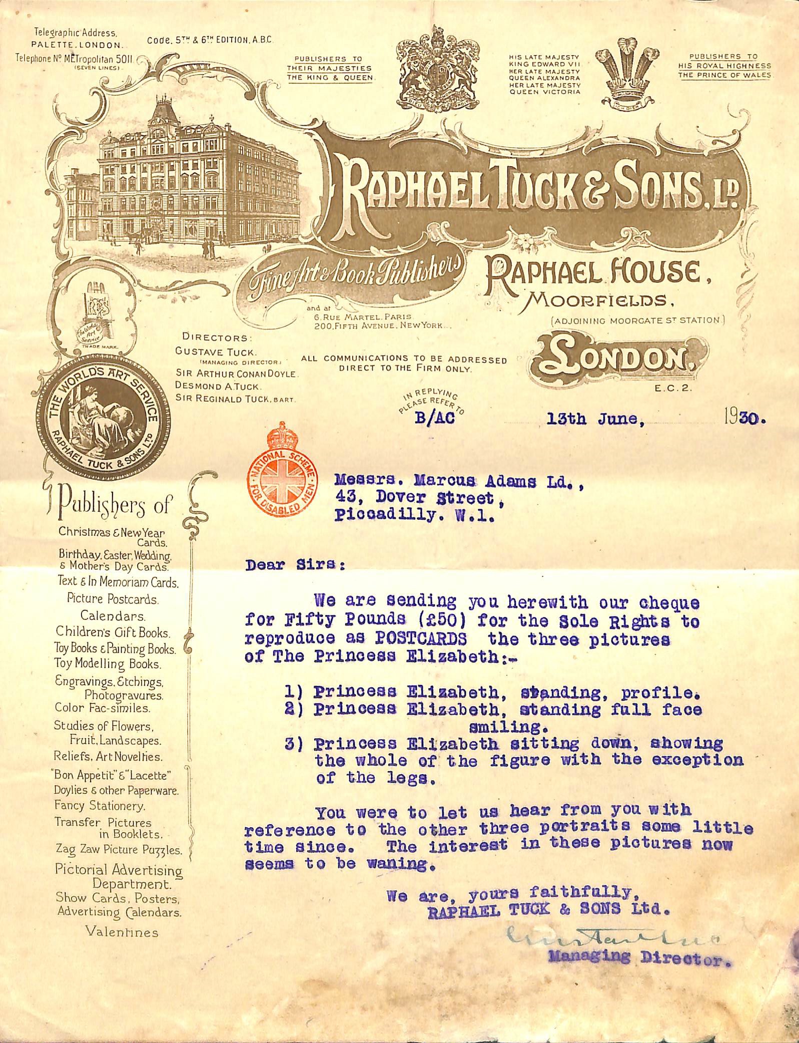 five are signed by Gustave Tuck, three by Desmond A. Tuck and one by Sir Reginald Tuck (the three men being named on the letterhead, together with Sir Arthur Conan Doyle, as the company's directors). Four are addressed to Adams personally, four to his firm (with one for the attention of 'Miss Dorothy Clarke'), and one to Bertram Adams, another royal photographer, with whom Adams shared premises at 43 Dover Street, Mayfair. The ornate letterhead, printed in brown, carries royal warrants and an engraving of Raphael House.