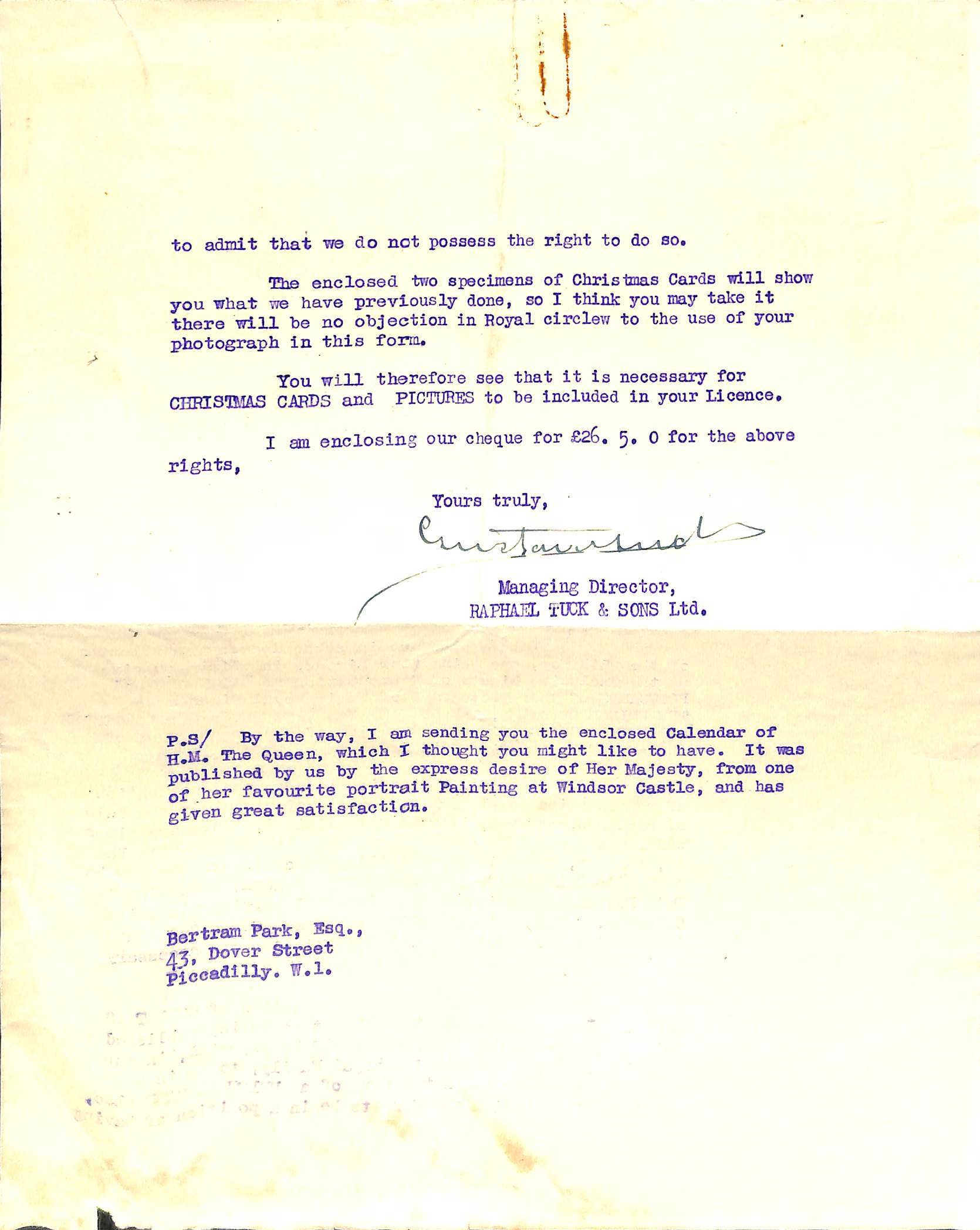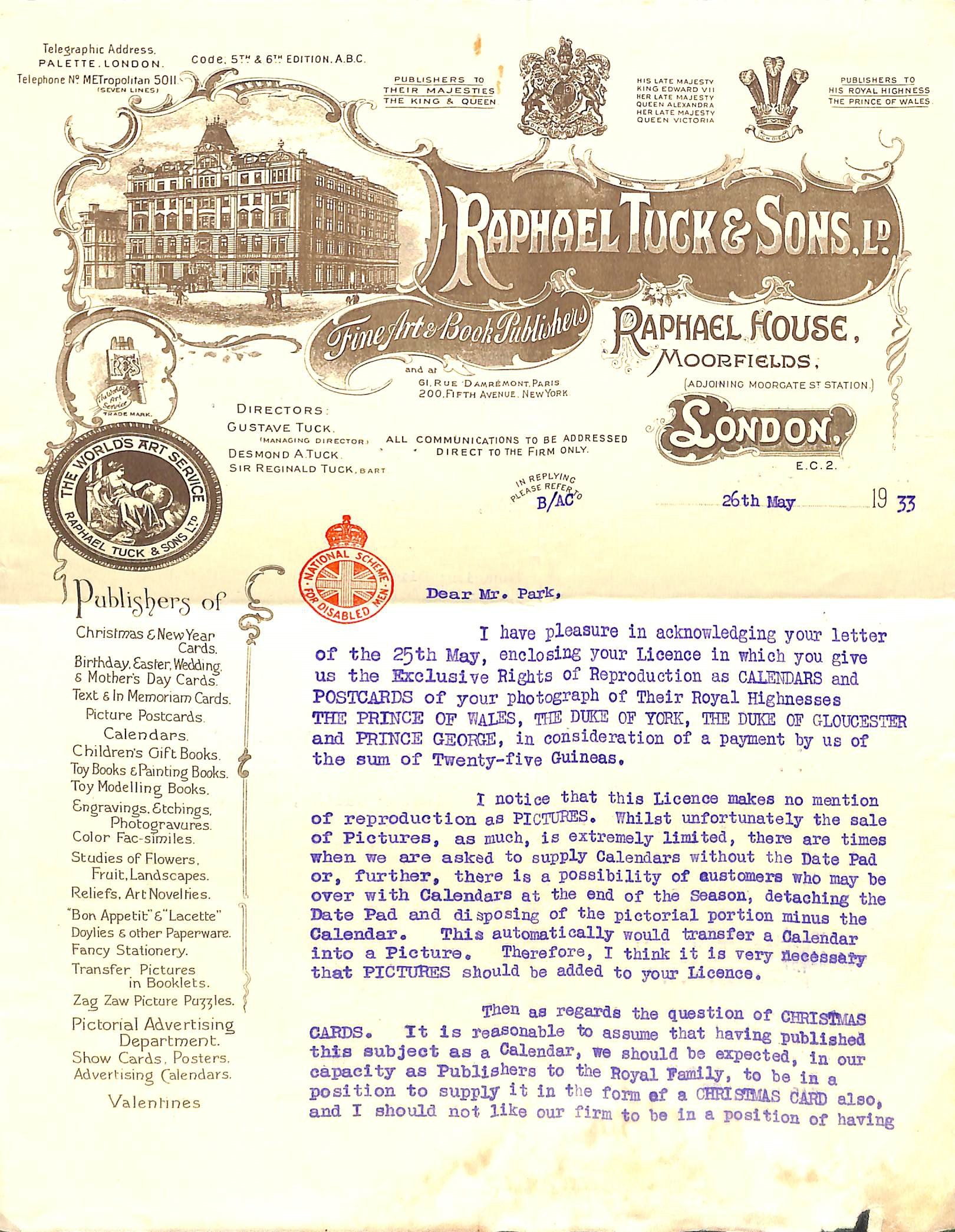 five are signed by Gustave Tuck, three by Desmond A. Tuck and one by Sir Reginald Tuck (the three men being named on the letterhead, together with Sir Arthur Conan Doyle, as the company's directors). Four are addressed to Adams personally, four to his firm (with one for the attention of 'Miss Dorothy Clarke'), and one to Bertram Adams, another royal photographer, with whom Adams shared premises at 43 Dover Street, Mayfair. The ornate letterhead, printed in brown, carries royal warrants and an engraving of Raphael House.