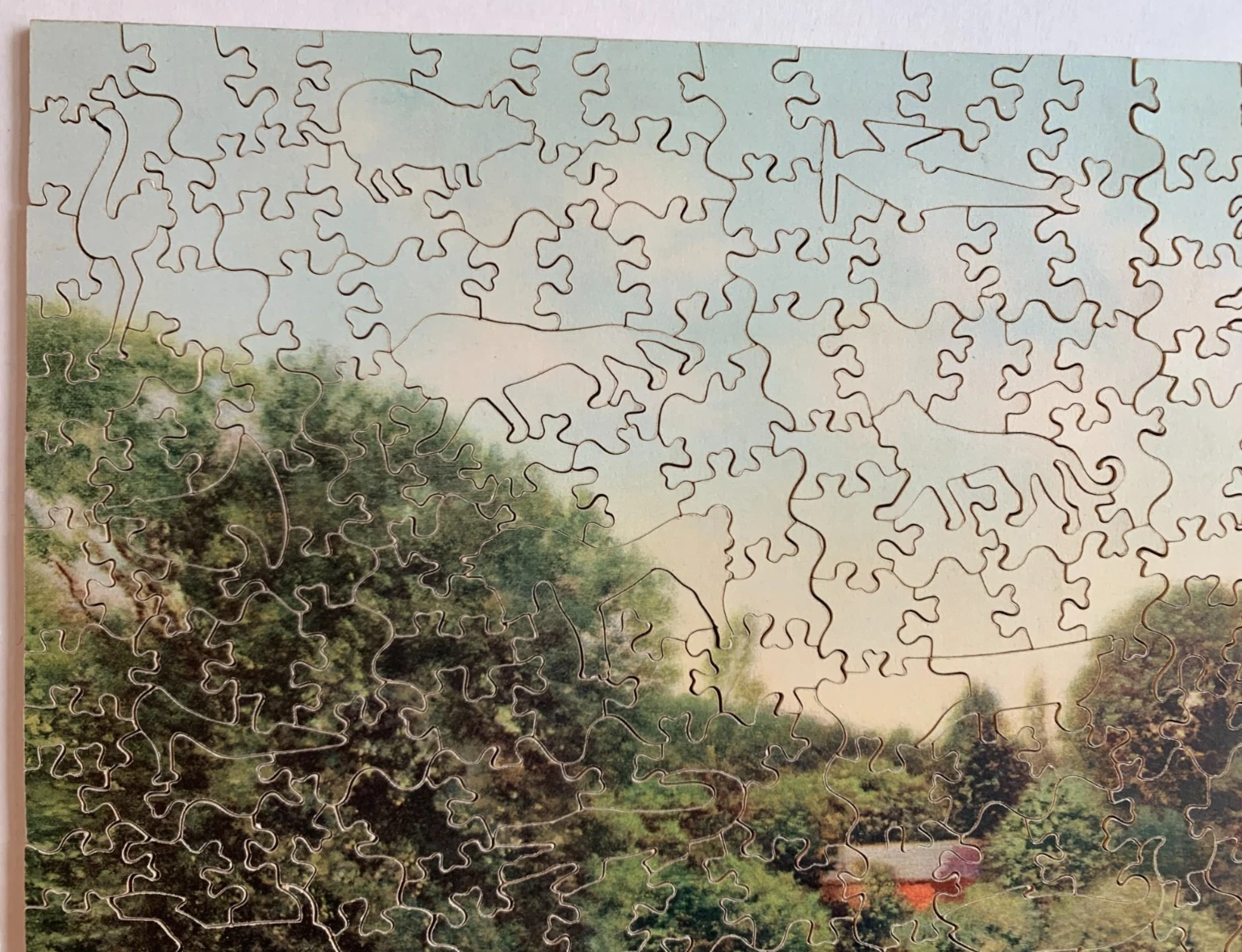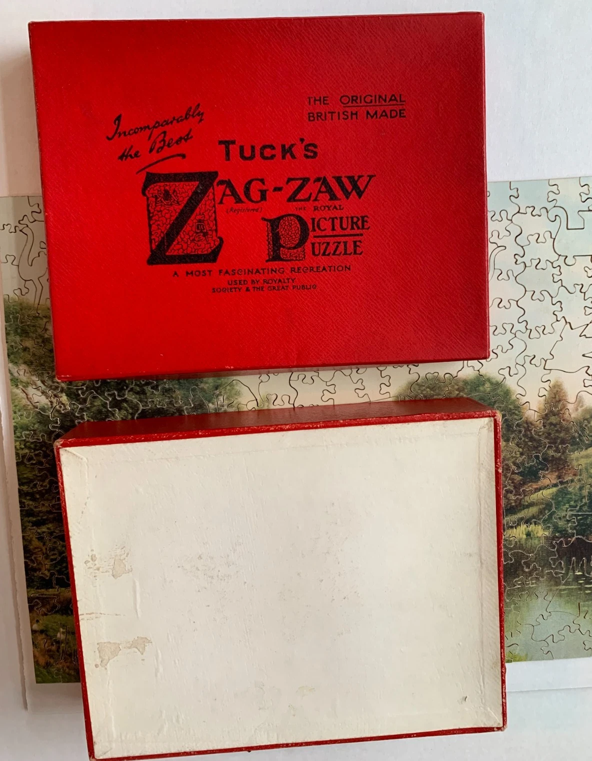 Zag-Zaw line of puzzles was first produced in 1909, most incorporate figurals or whimsies, sold in red, orange, or occasionally green boxes with labels on the side or bottom of the box, most without guide pictures. Initially cut non-interlocking but by 1930's became more so. Puzzles have a different cuts so that the same image will come in several versions which means that missing pieces can not be taken from other puzzles with the same image. The puzzle labels are often hand written and come with minor variations in titles and details. Some have a DESIGN category on the label. From my readings this refers to the style of cut, wavy lines, figurals, etc. See also Bob Armstrong's website on old jigsaw puzzles
