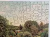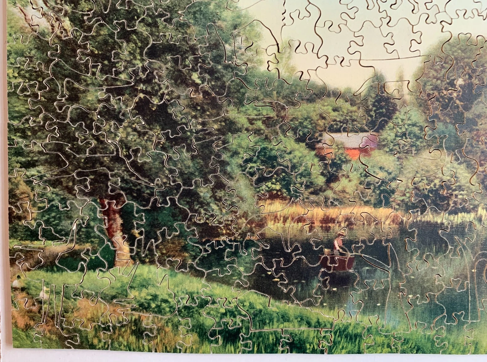 BACKWATERS, man in small boat fishing on pond, house in background, prominentt tree left