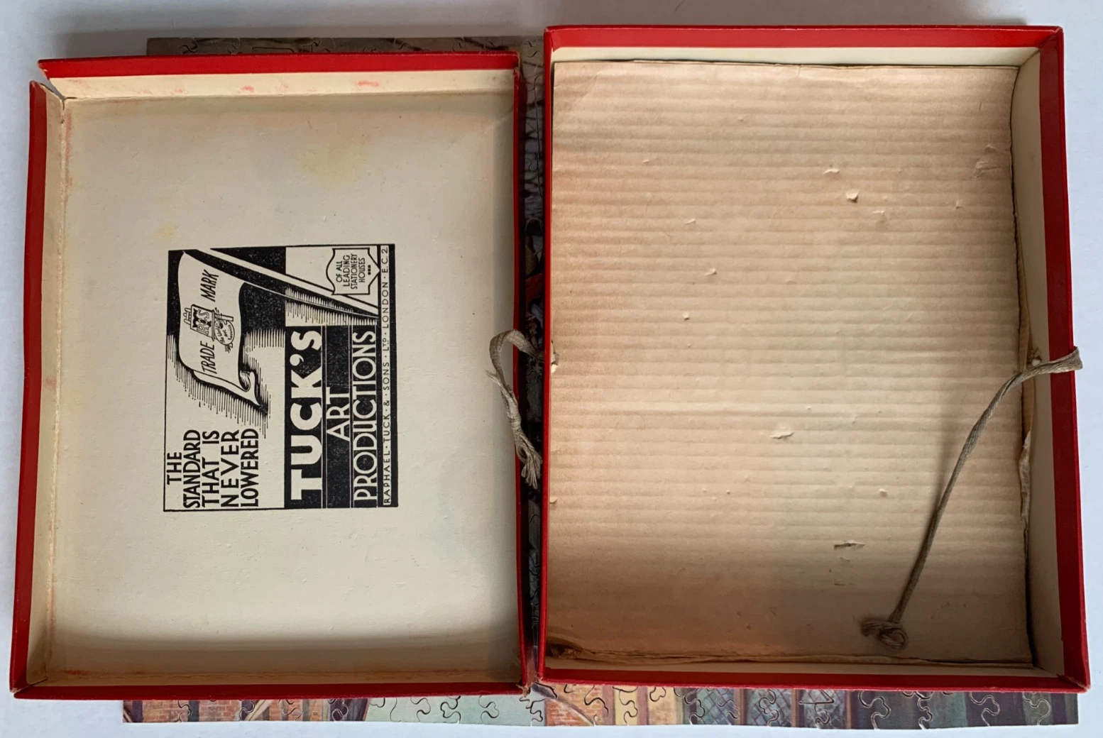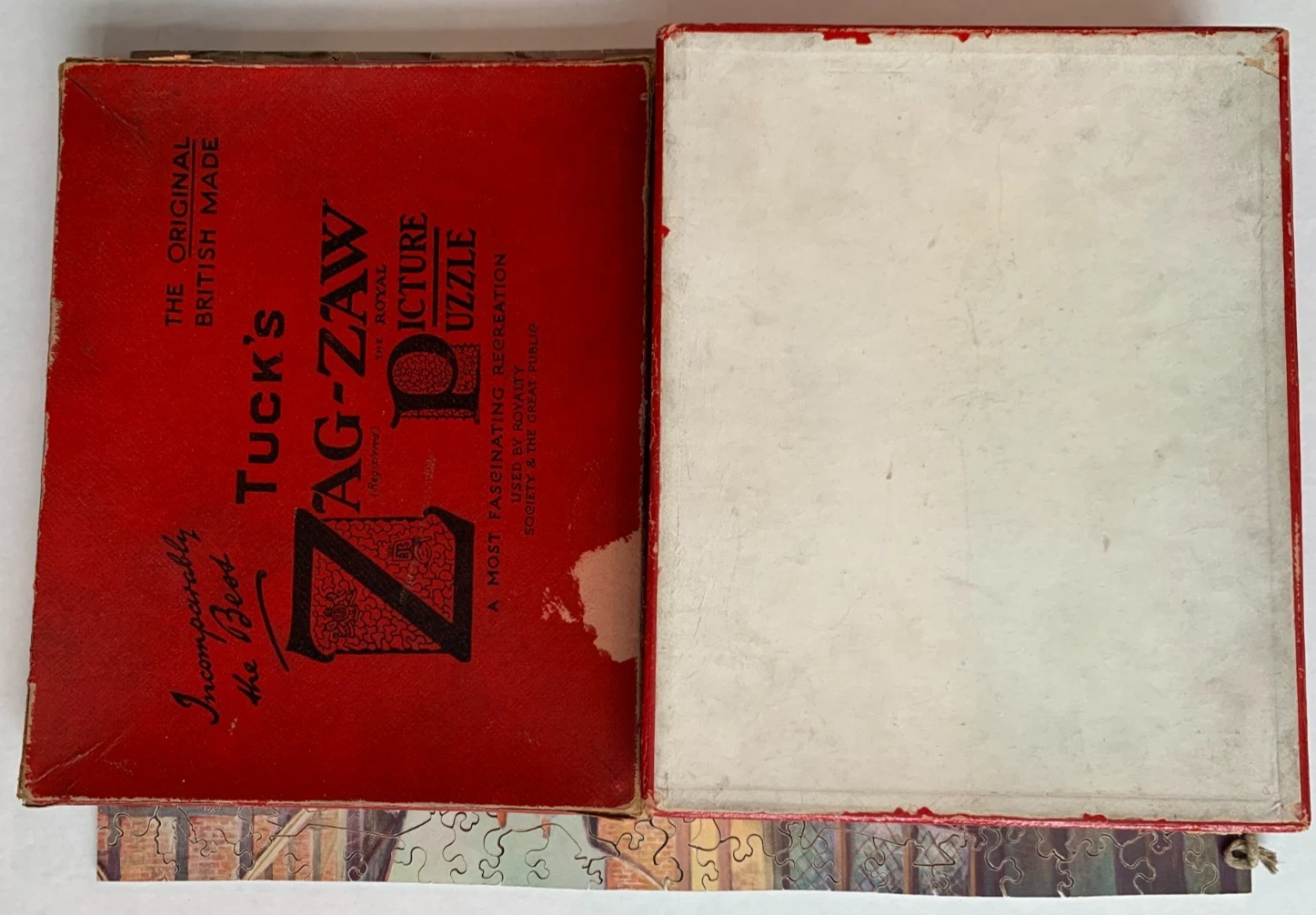 Zag-Zaw line of puzzles was first produced in 1909, most incorporate figurals or whimsies, sold in red, orange, or occasionally green boxes with labels on the side or bottom of the box, most without guide pictures. Initially cut non-interlocking but by 1930's became more so. Puzzles have a different cuts so that the same image will come in several versions which means that missing pieces can not be taken from other puzzles with the same image. The puzzle labels are often hand written and come with minor variations in titles and details. Some have a DESIGN category on the label. From my readings this refers to the style of cut, wavy lines, figurals, etc. See also Bob Armstrong's website on old jigsaw puzzles