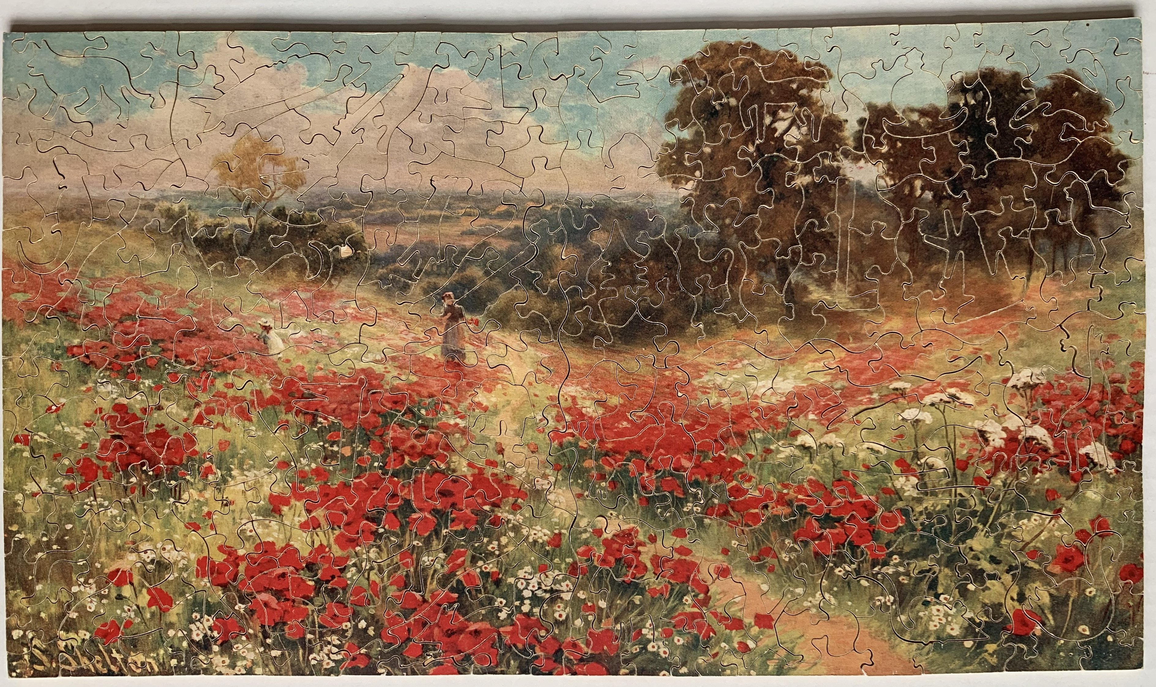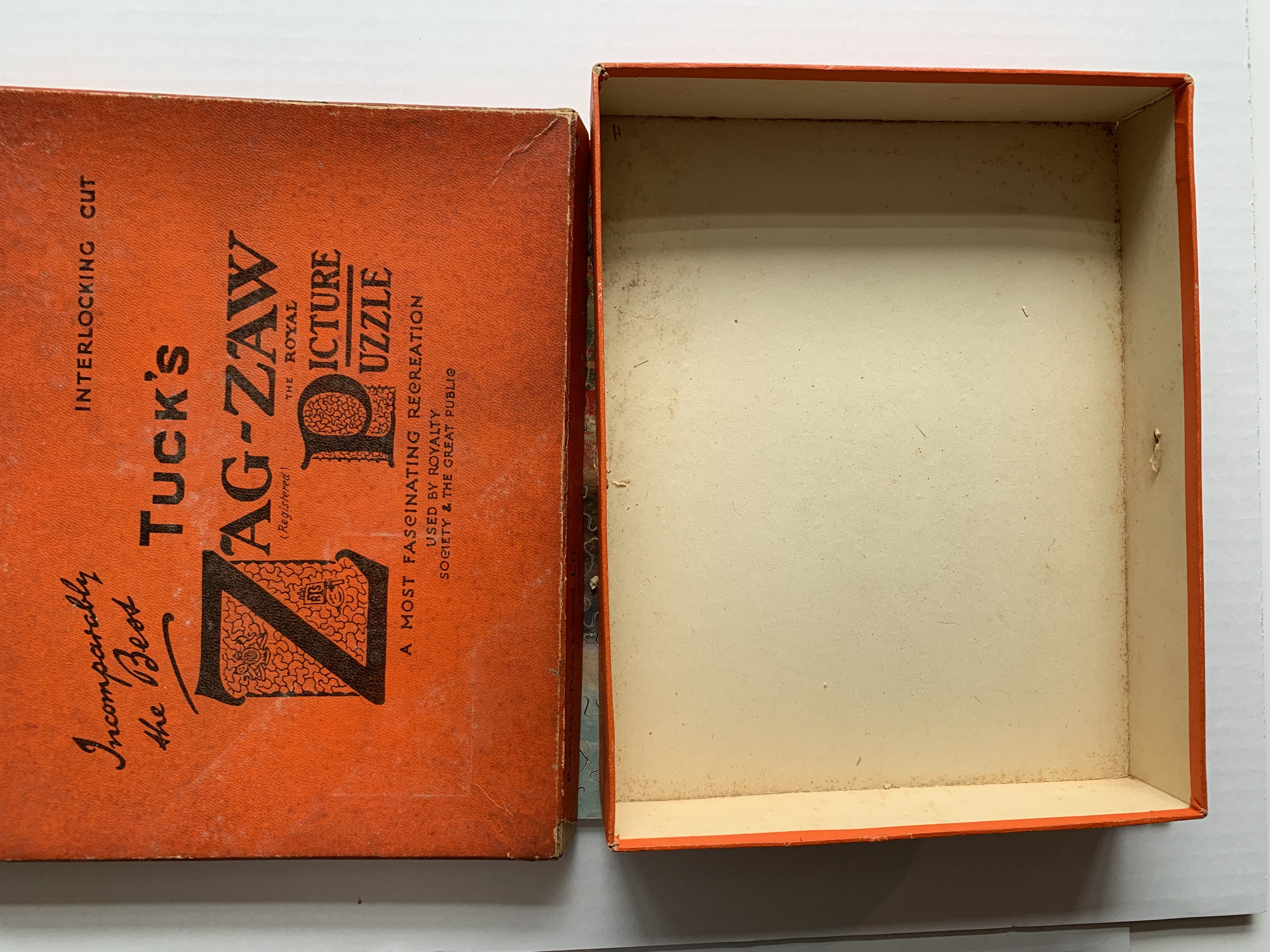 Zag-Zaw line of puzzles was first produced in 1909, most incorporate figurals or whimsies, sold in red, orange, or occasionally green boxes with labels on the side or bottom of the box, most without guide pictures. Initially cut non-interlocking but by 1930's became more so. Puzzles have a different cuts so that the same image will come in several versions which means that missing pieces can not be taken from other puzzles with the same image. The puzzle labels are often hand written and come with minor variations in titles and details. Some have a DESIGN category on the label. From my readings this refers to the style of cut, wavy lines, figurals, etc. See also Bob Armstrong's website on old jigsaw puzzles