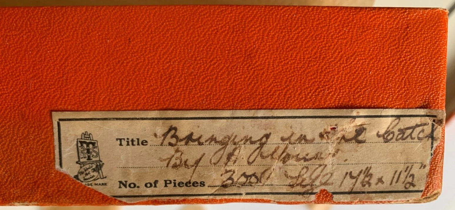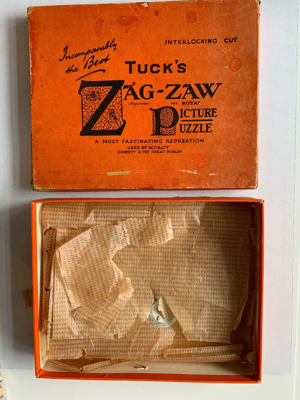 Zag-Zaw line of puzzles was first produced in 1909, most incorporate figurals or whimsies, sold in red, orange, or occasionally green boxes with labels on the side or bottom of the box, most without guide pictures. Initially cut non-interlocking but by 1930's became more so. Puzzles have a different cuts so that the same image will come in several versions which means that missing pieces can not be taken from other puzzles with the same image. The puzzle labels are often hand written and come with minor variations in titles and details. Some have a DESIGN category on the label. From my readings this refers to the style of cut, wavy lines, figurals, etc. See also Bob Armstrong's website on old jigsaw puzzles