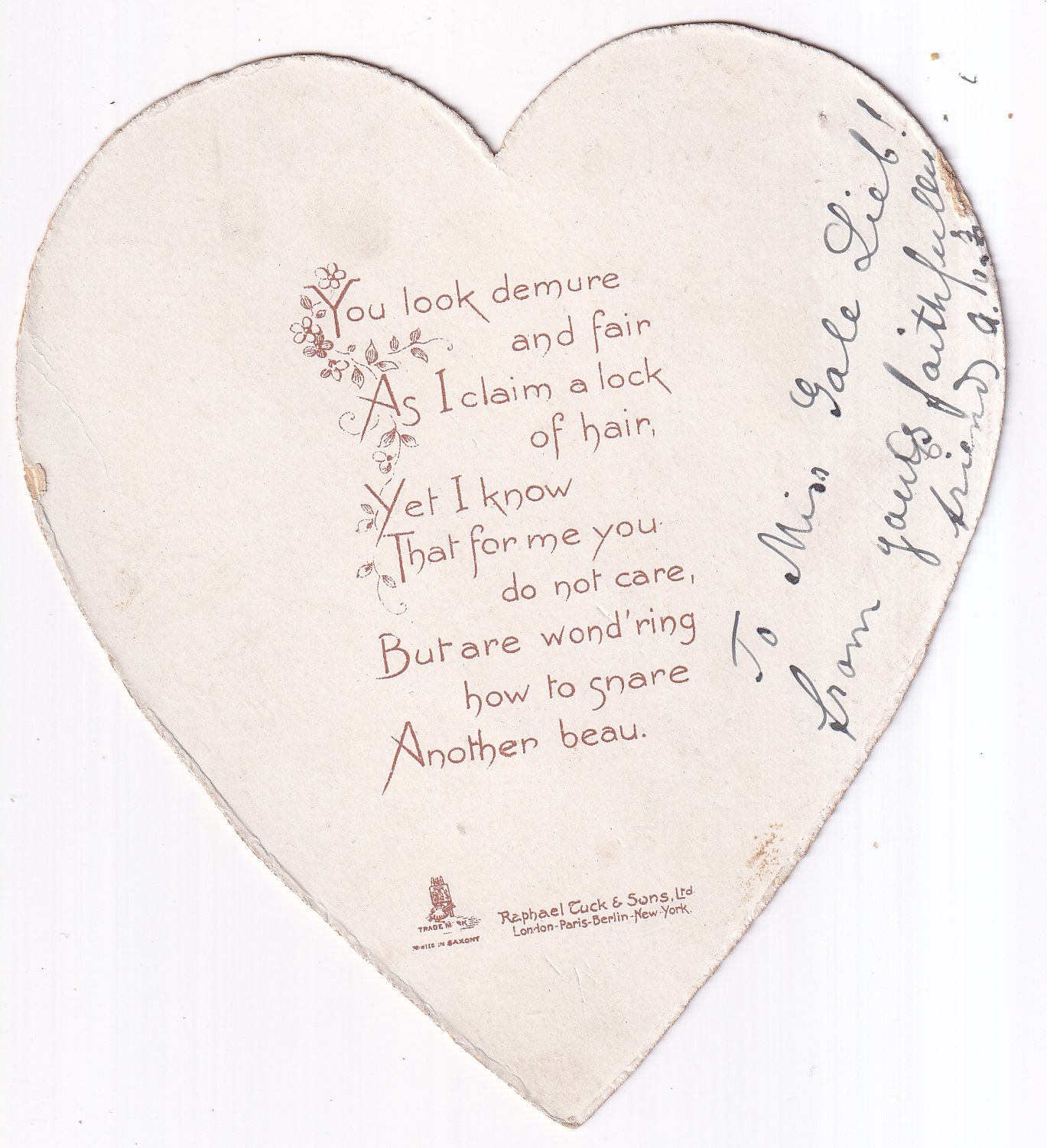 YOU LOOK DEMURE AND FAIR AS I CLAIM A LOCK OF HAIR, YET I KNOW THAT FOR ME YOU DO NOT CARE, BUT ARE WOND'RING HOW TO SNARE ANOTHER BEAU.