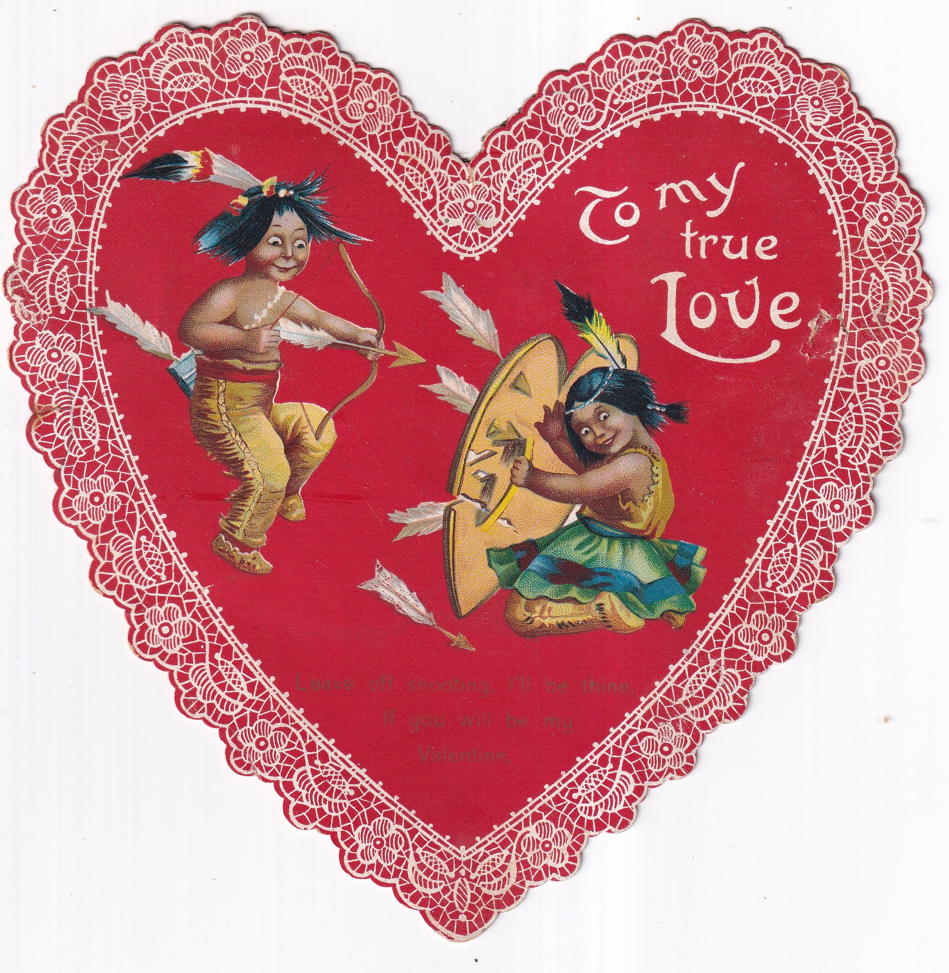 TO MY TRUE LOVE, Indian boy fires arrow's at Indian girl hiding behind a large heart shield