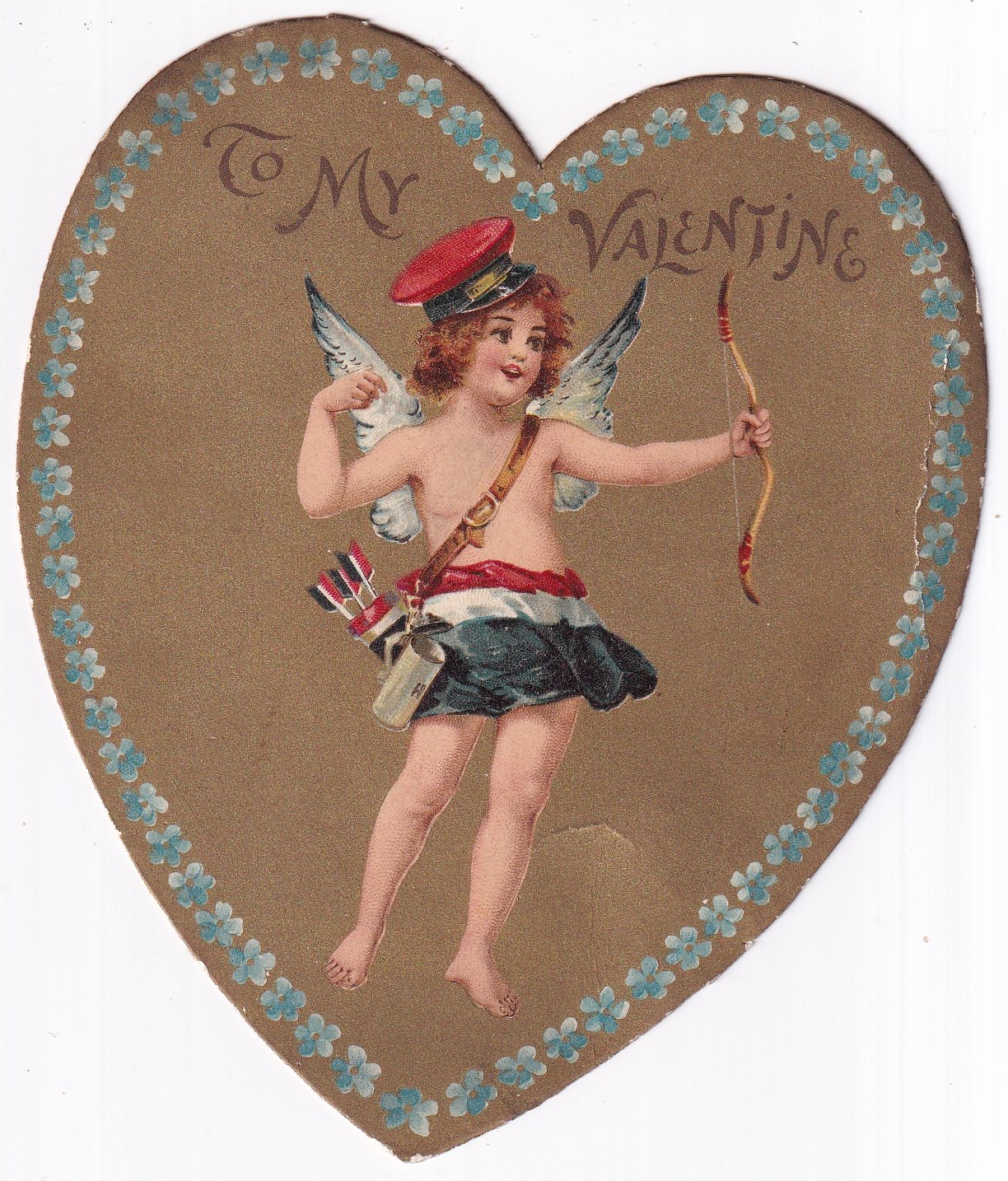 TO MY VALENTINE, cupid with bow, arrow, wears red, white and blue skirt and hat