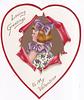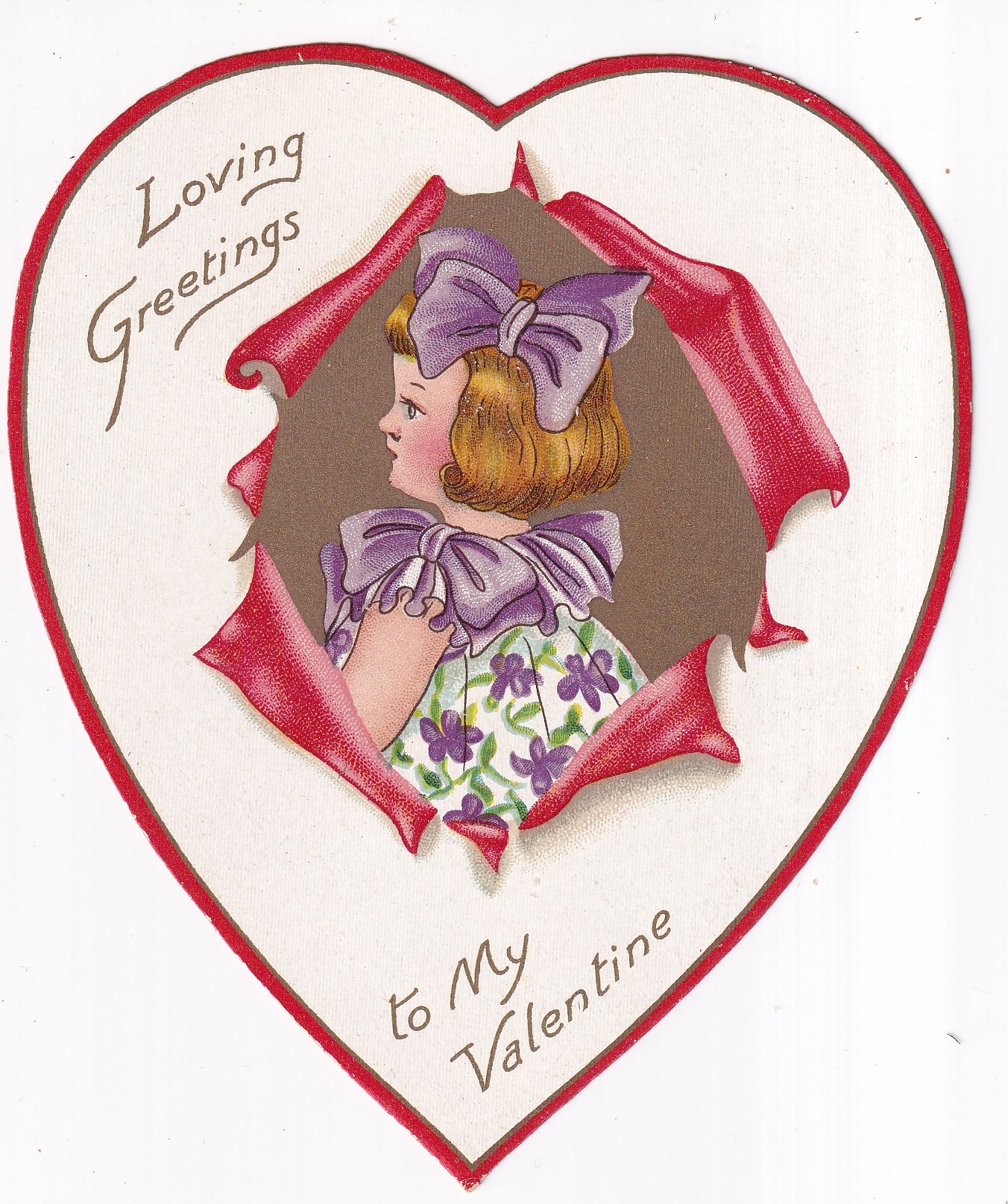 LOVING GREETINGS TO MY VALENTINE, girl in purple dress and bow, she faces left