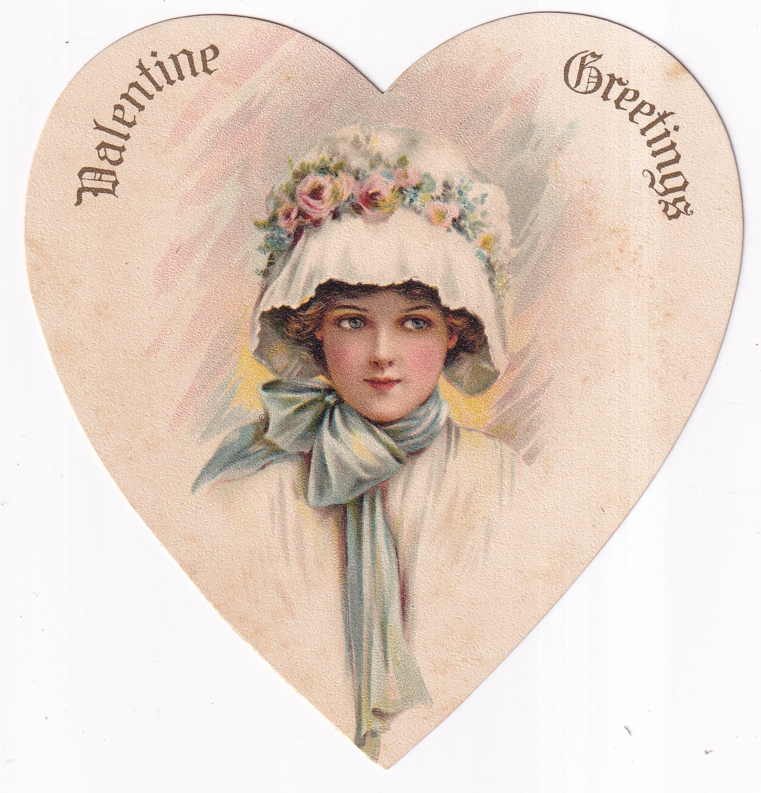VALENTINE GREETINGS, glamor girl, blue scarf, mop type hat with rose garland,