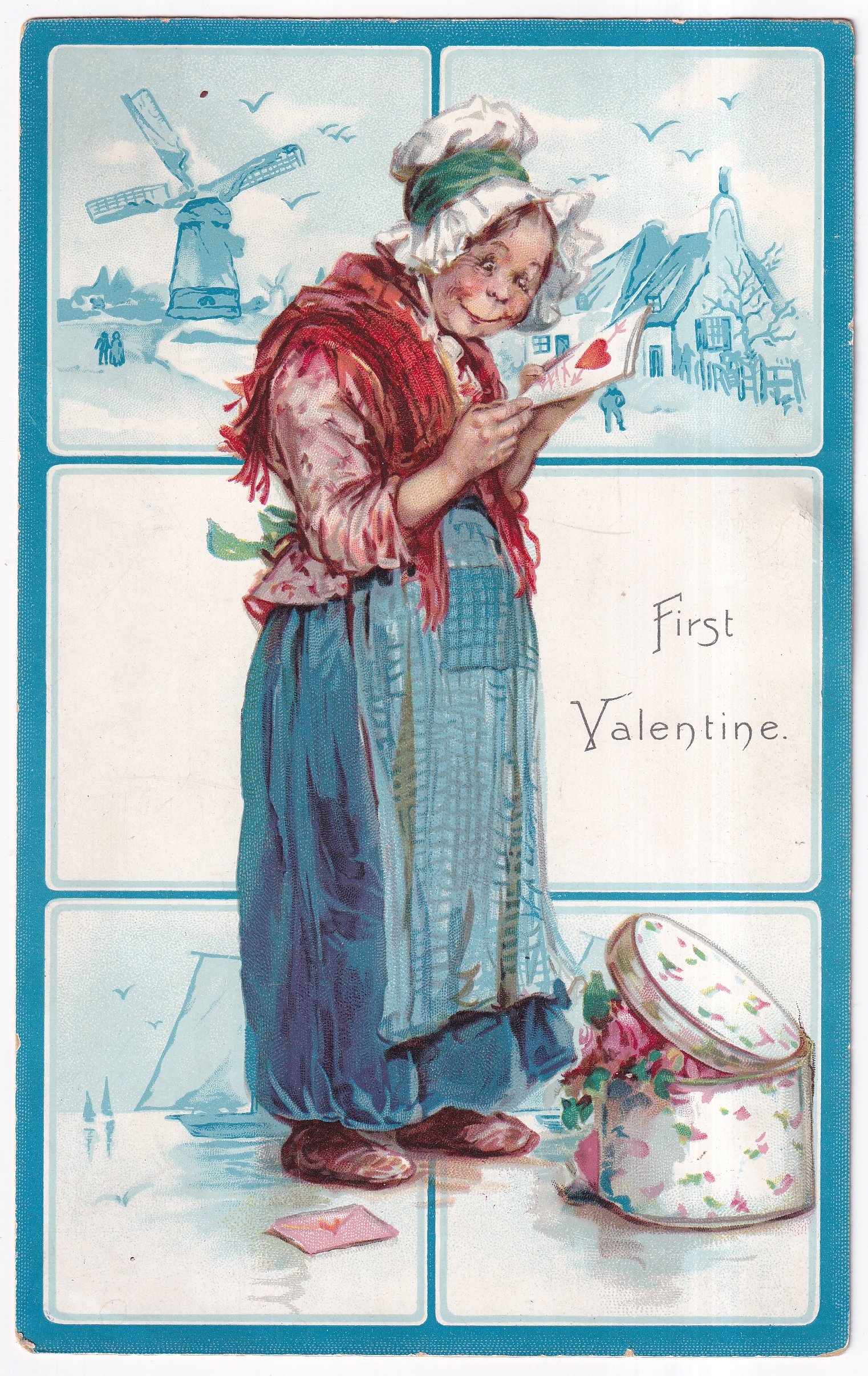 Valentine, rectangular panel, Dutch characters, artist Brundage, Delft style views in background