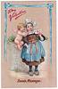Dutch girl with blue skirt reads a Valentine card as cupid sits beside her
