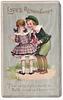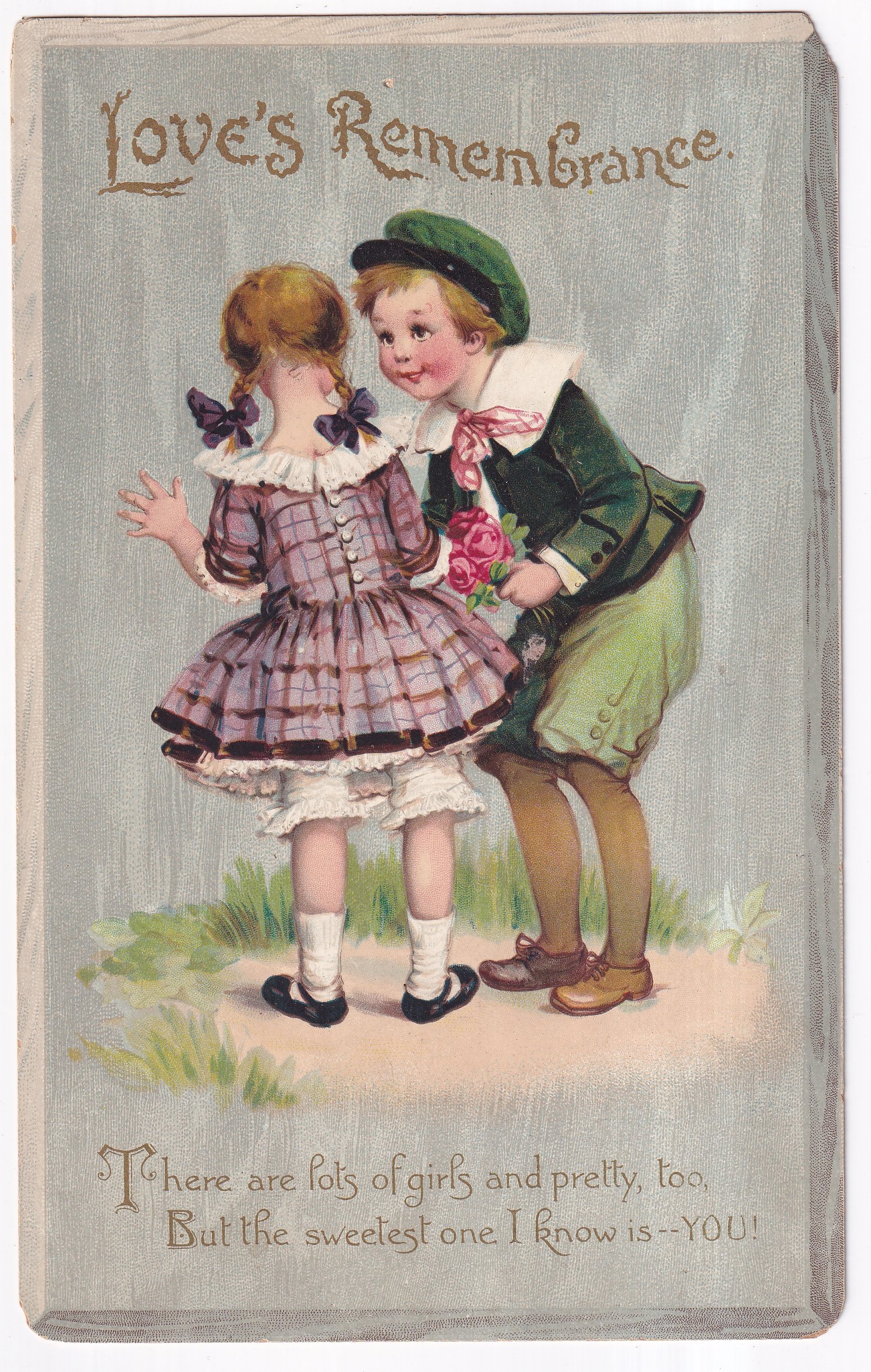 LOVE'S REMEMBRANCE, boy in green with roses, girl in purple plaid dress