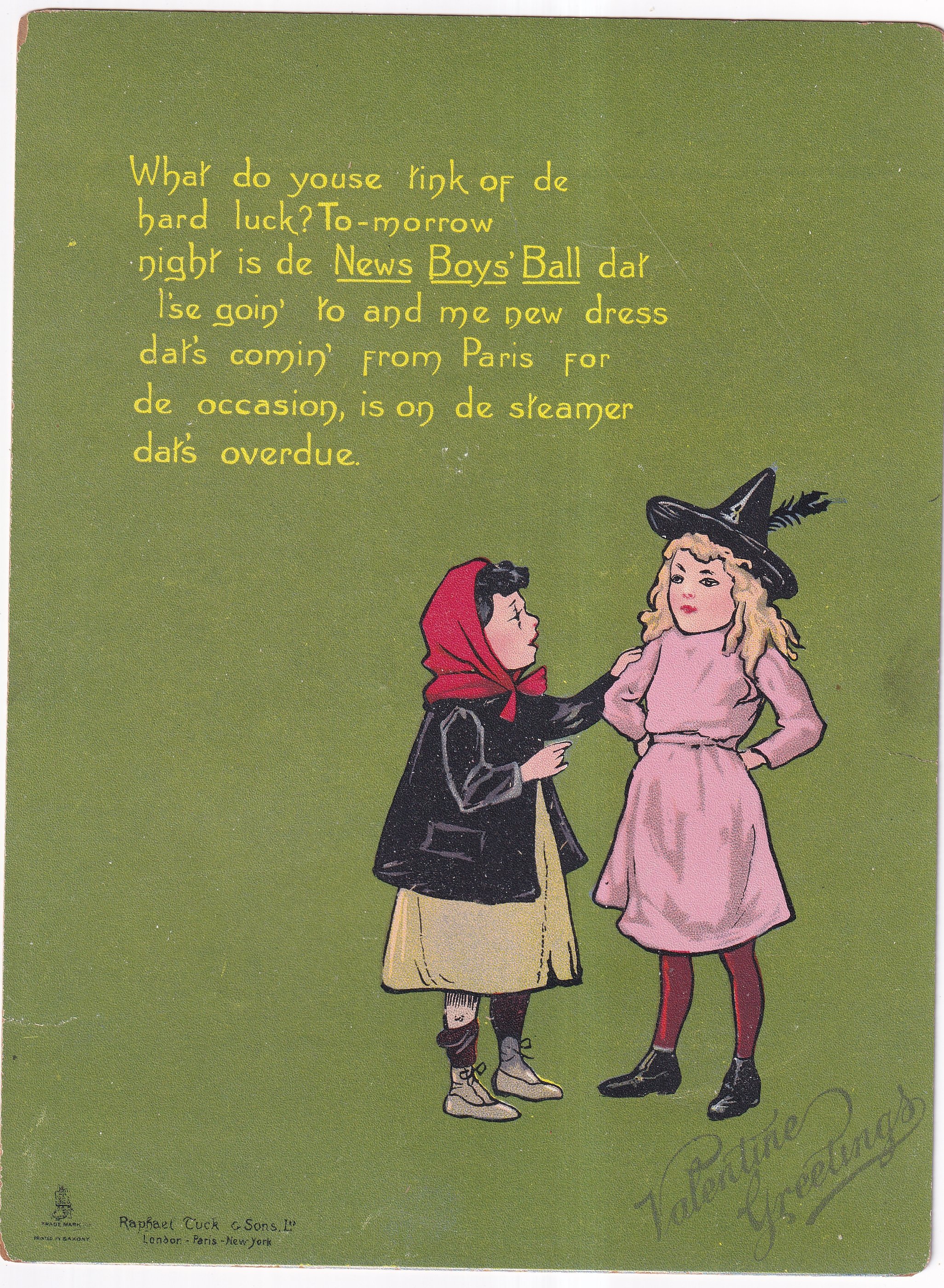 WHAT DO YOUSE TINK OF DE HARD LUCK? TO-MORROW NIGHT IS DE NEWS BOYS' BALL DAT I'SE GOIN TO AND ME NEW DRESS DAT'S COMIN'' FROM PARIS FOR DE OCCASION, IS ONDE STEAMER DAT'S OVERDUE.