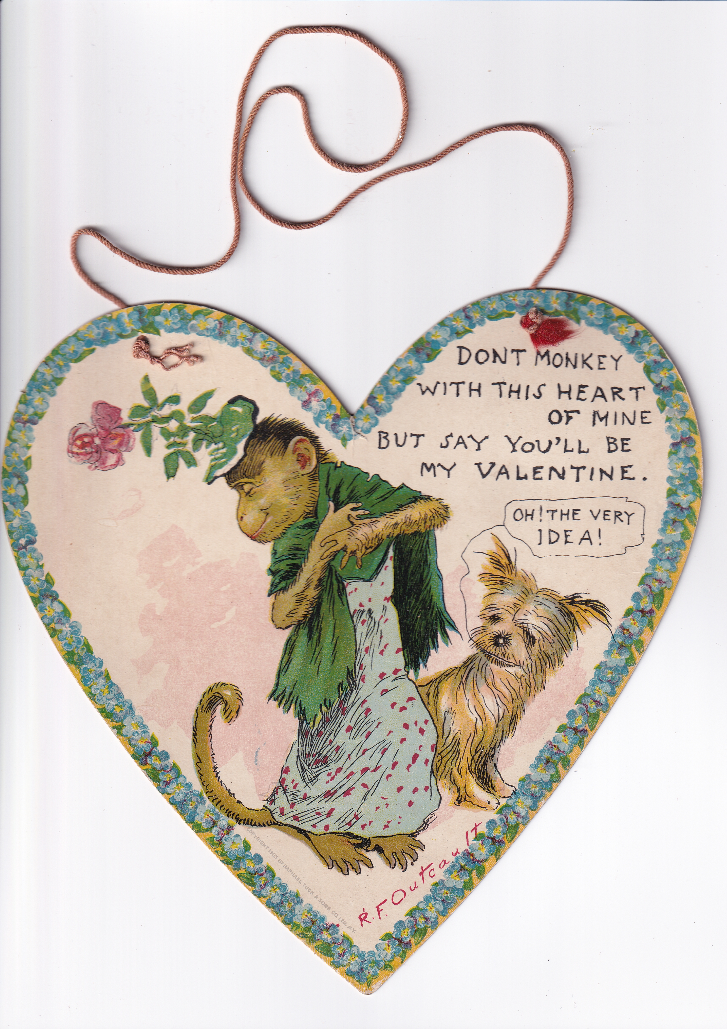 DON'T MONKEY WITH THIS HEART OF MINE BUT SAY YOU'LL BE MY VALENTINE. OH! THE VERY IDEA! thinks the dog