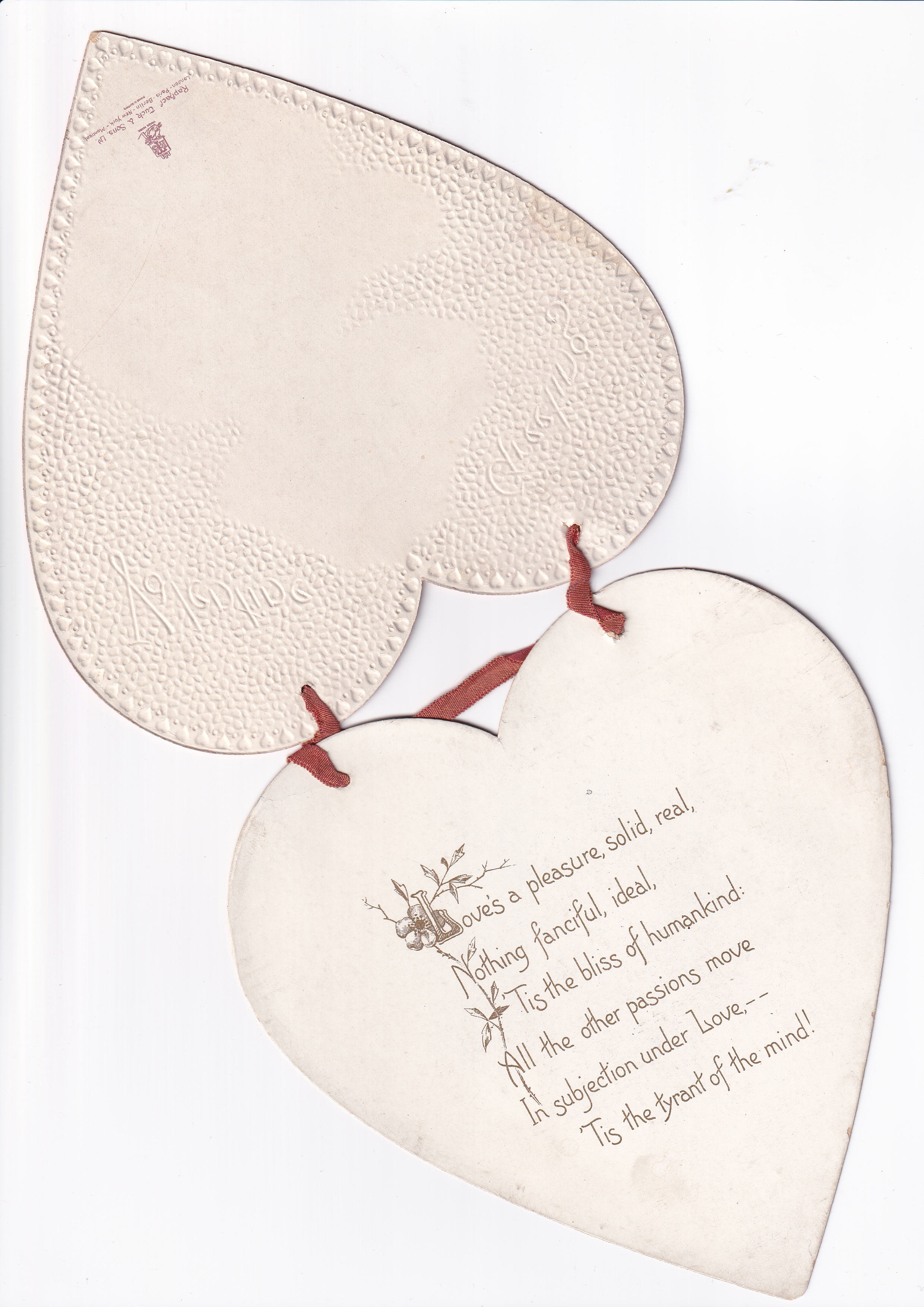 Valentine, heart shaped, glamour girl, red background, gold heart border, artist Brundage