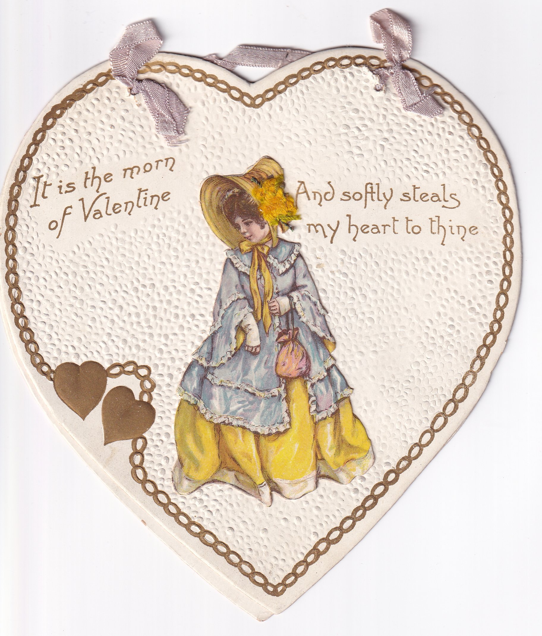 IT IS THE MORN OF VALENTINE, glamourous lady in yellow dress and hat, blue shawl, yellow applique cloth attached to hat