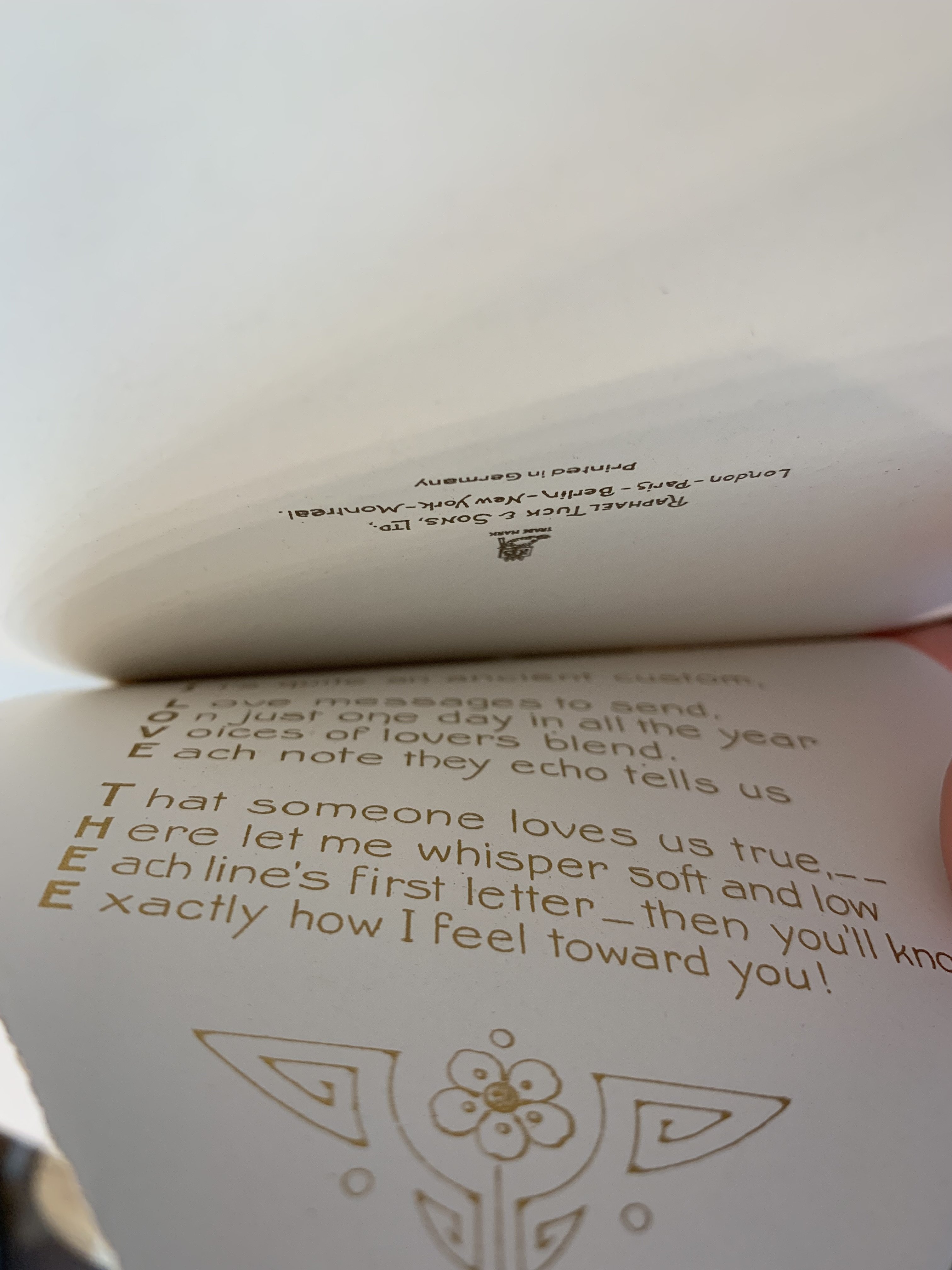 Verse on inner panel, first letter of each phrase SPELLS I LOVE YOU