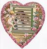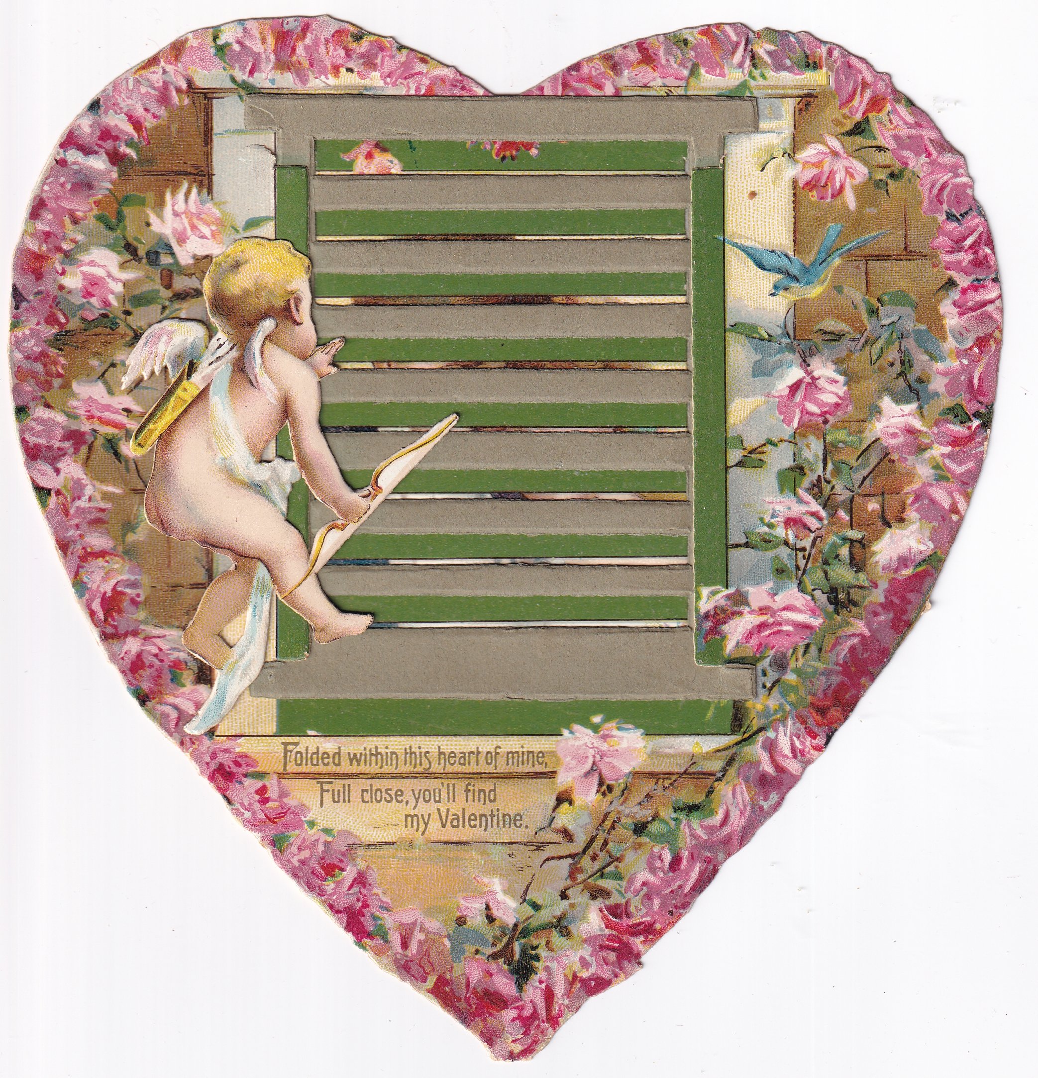 Mechanical, Heart shaped Valentine, Cupid peeks through the closed shutters, shutters slide open to reveal the image of two lovers. Cupid is hinged and pulls out to create a 3-D effect.
