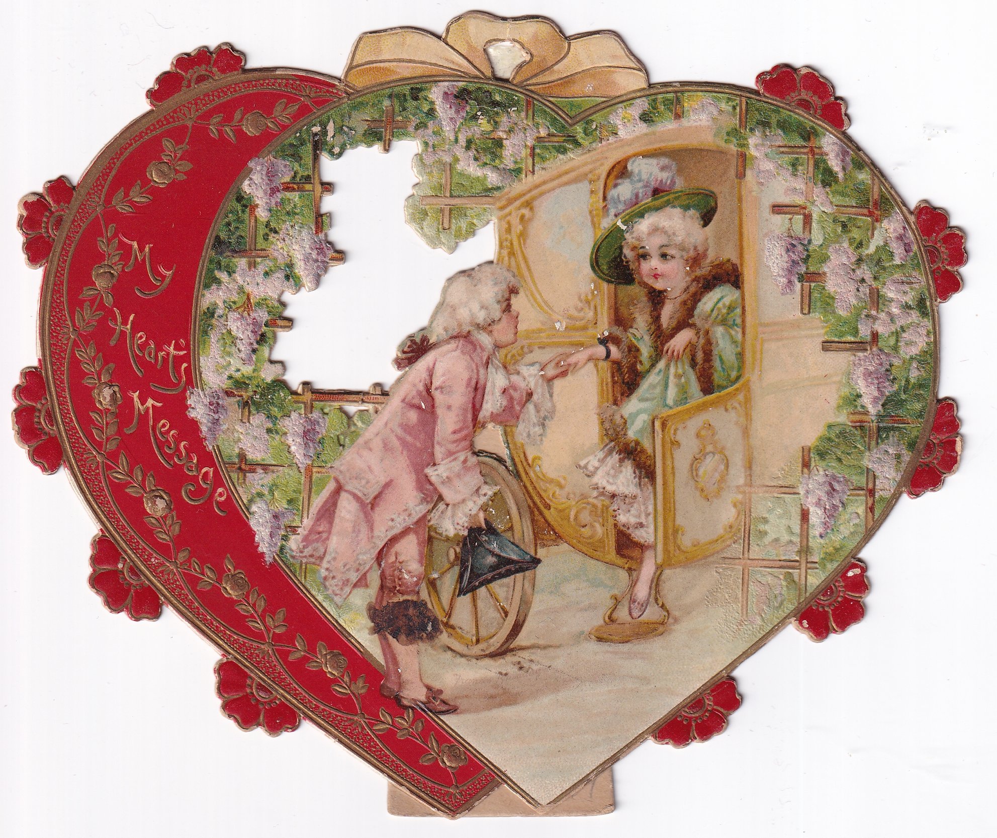 Valentine couple in courtly dress, he helps her dismount from stagecoach,