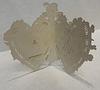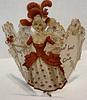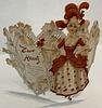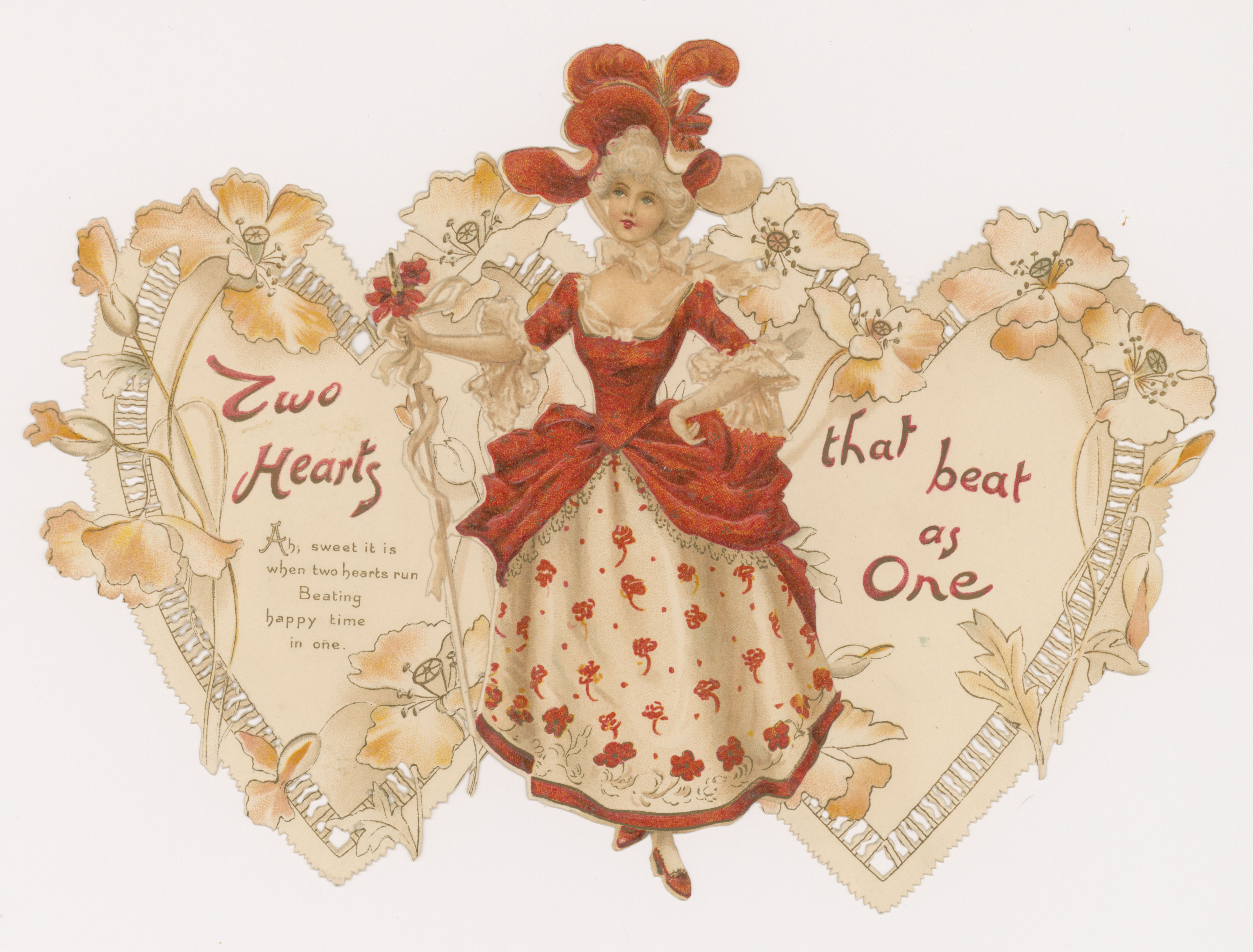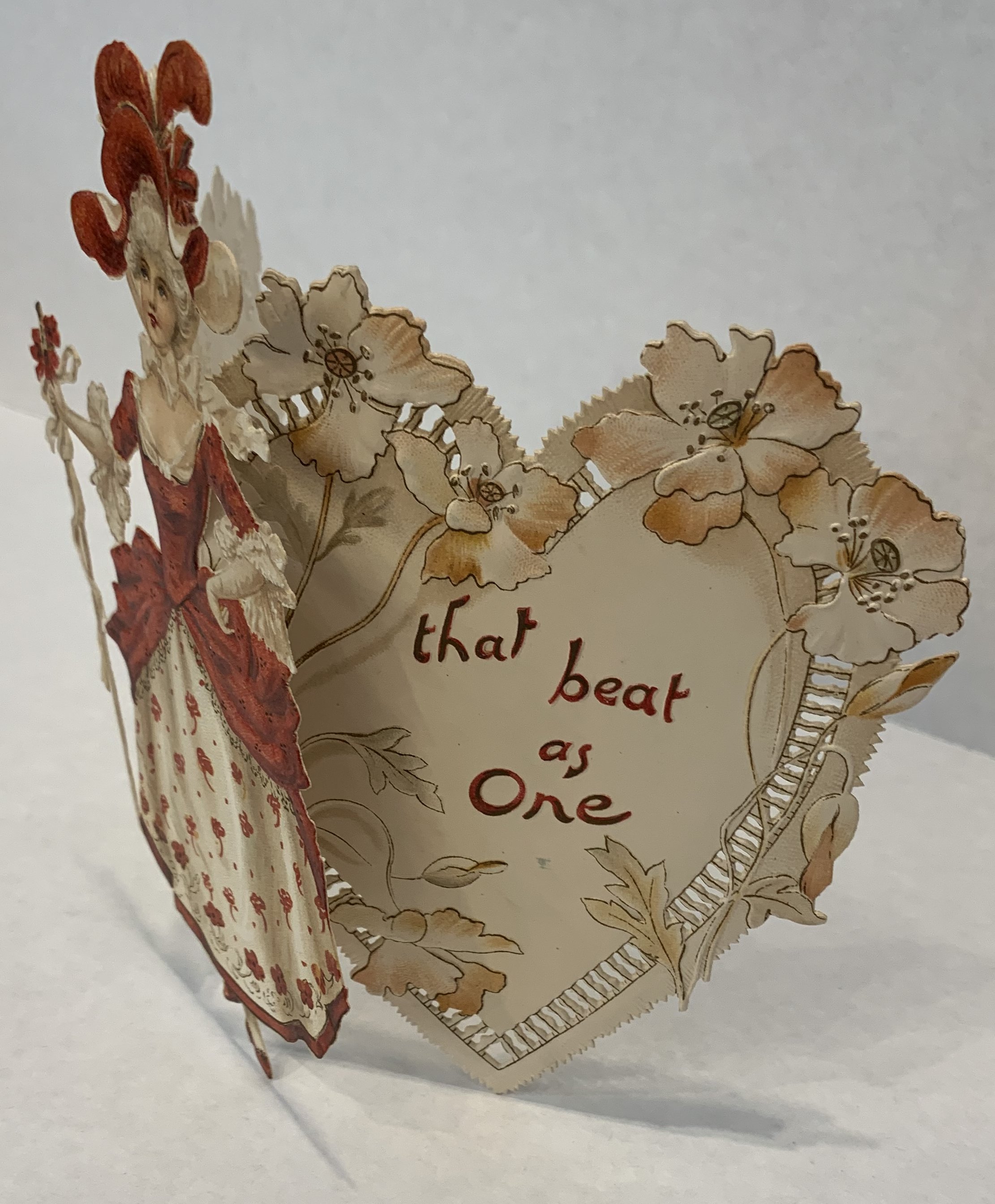 Large heart background, woman in fancy red gown, hat and feather plume, designed to stand