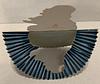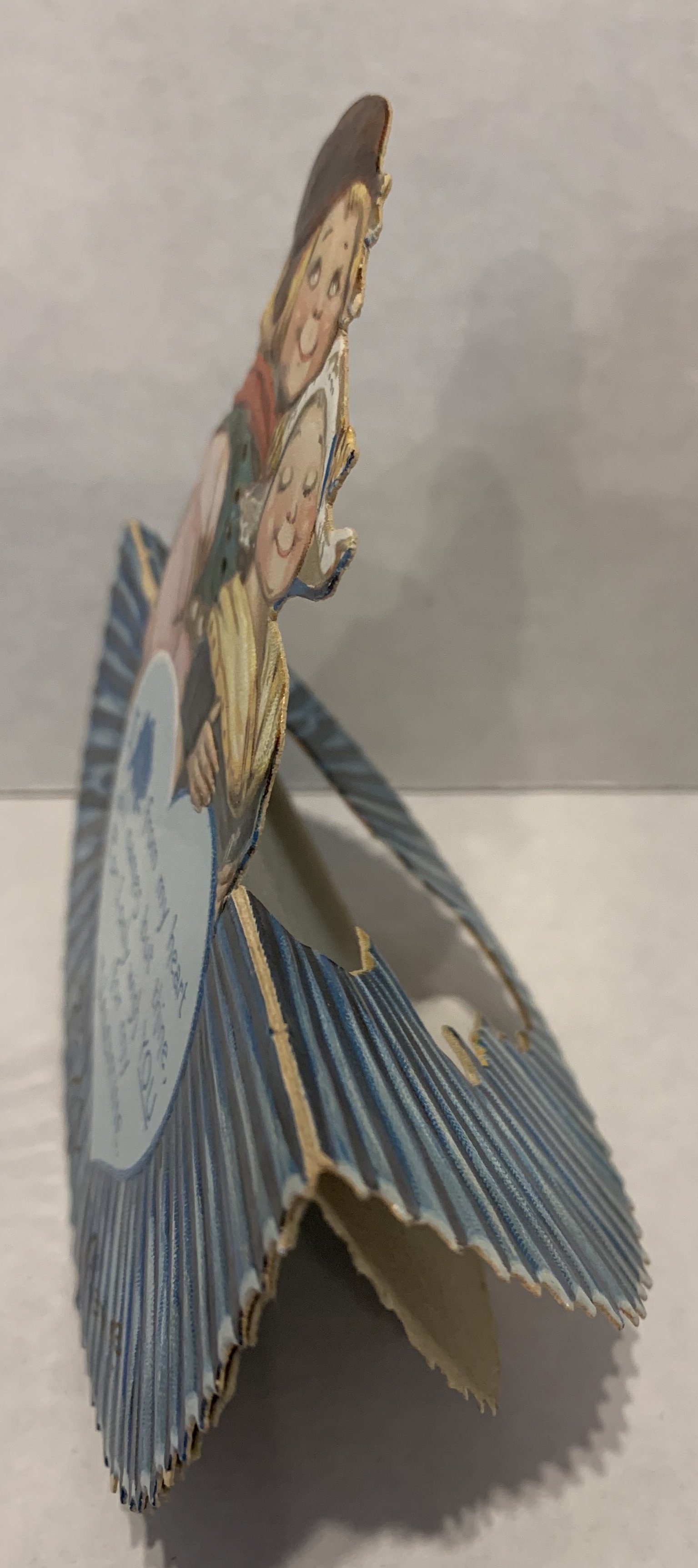 The ribbed background folds in half to create a stand, the characters are perforated and then stand out when the top background is bent backwards to make the stand.