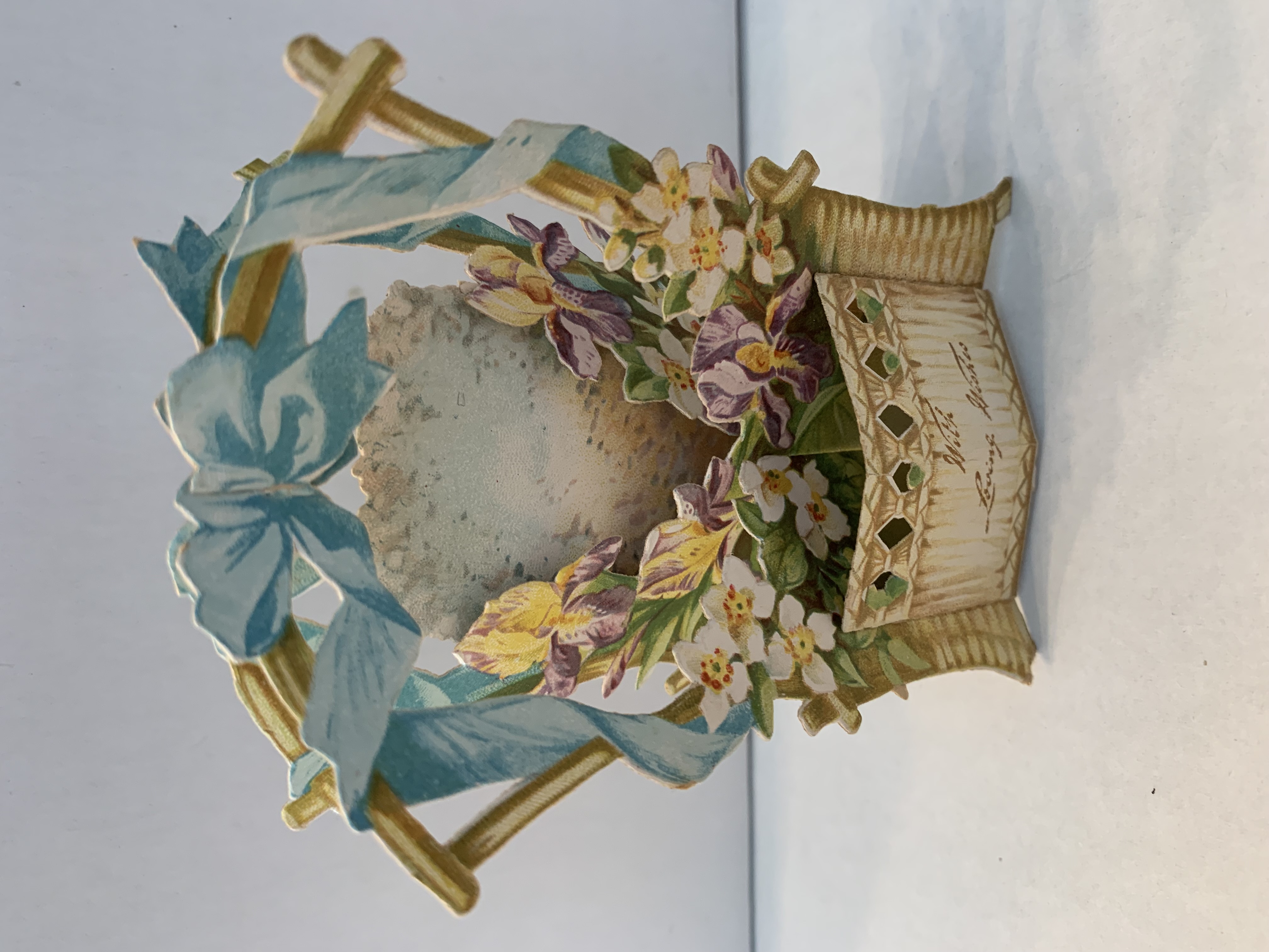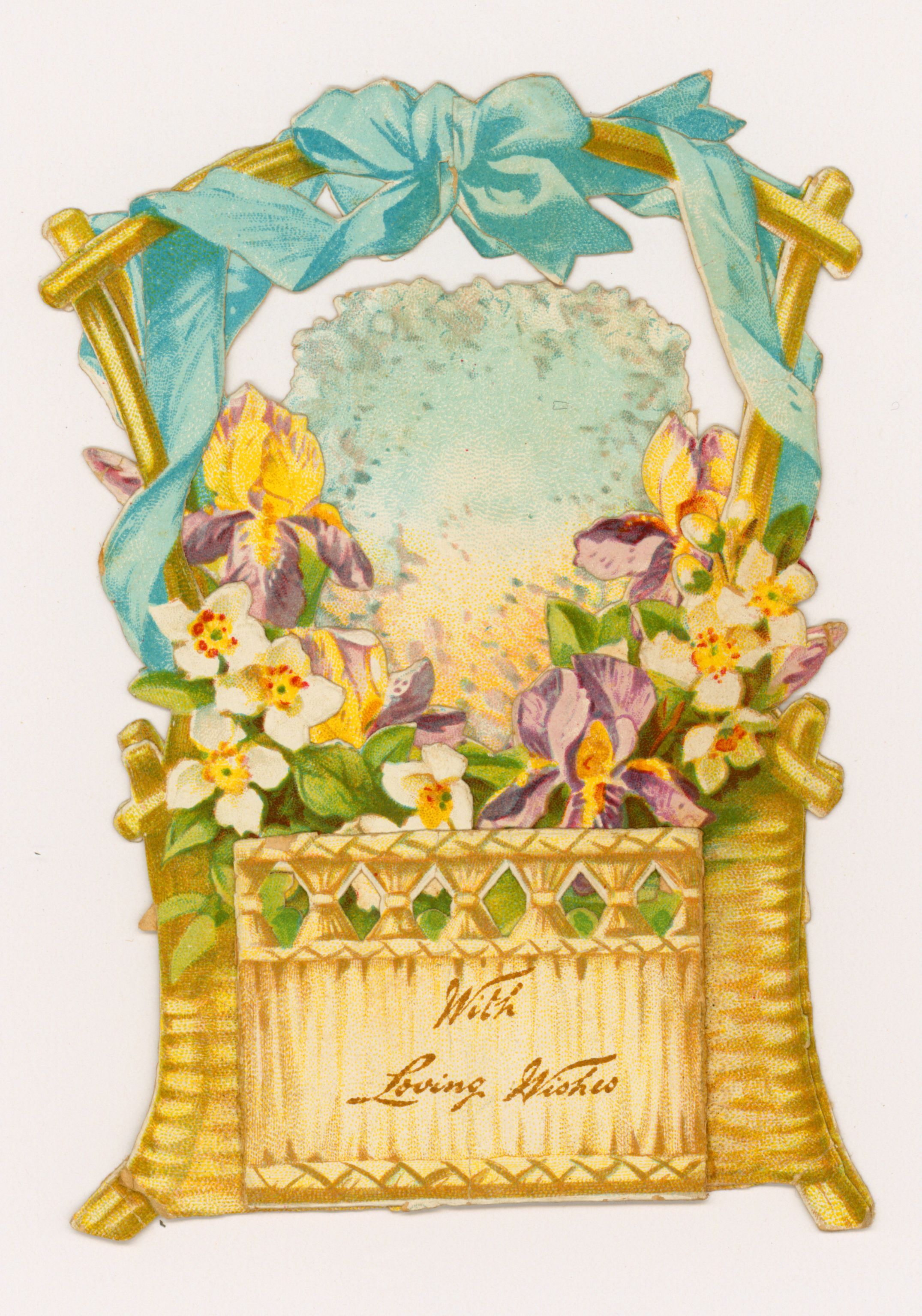 WITH LOVING WISHES, purple and white flowers, wicker basket