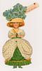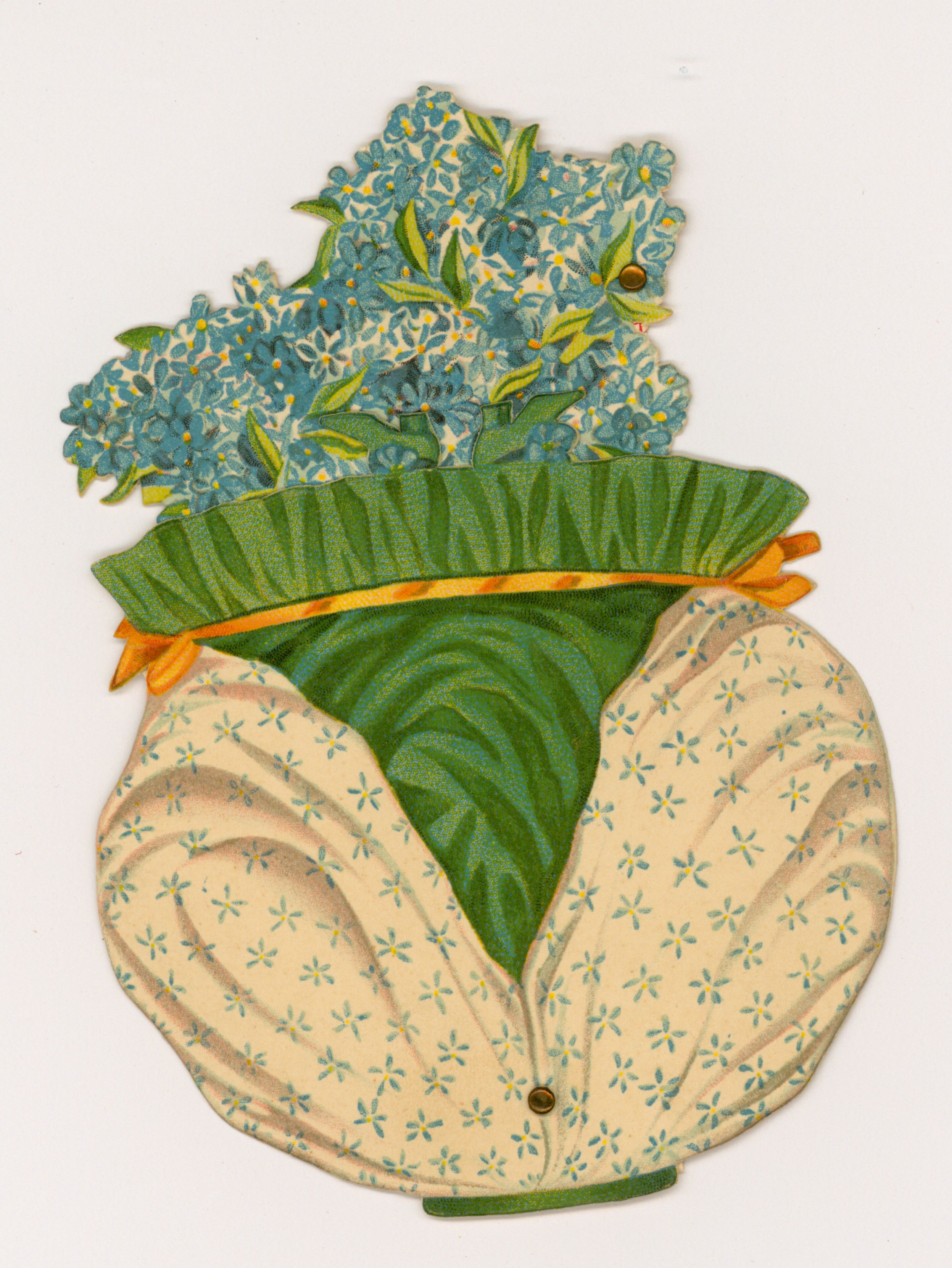 Valentine, girl in large green and white dress, large hat with blue forget me not flowers, spins into a flower pot