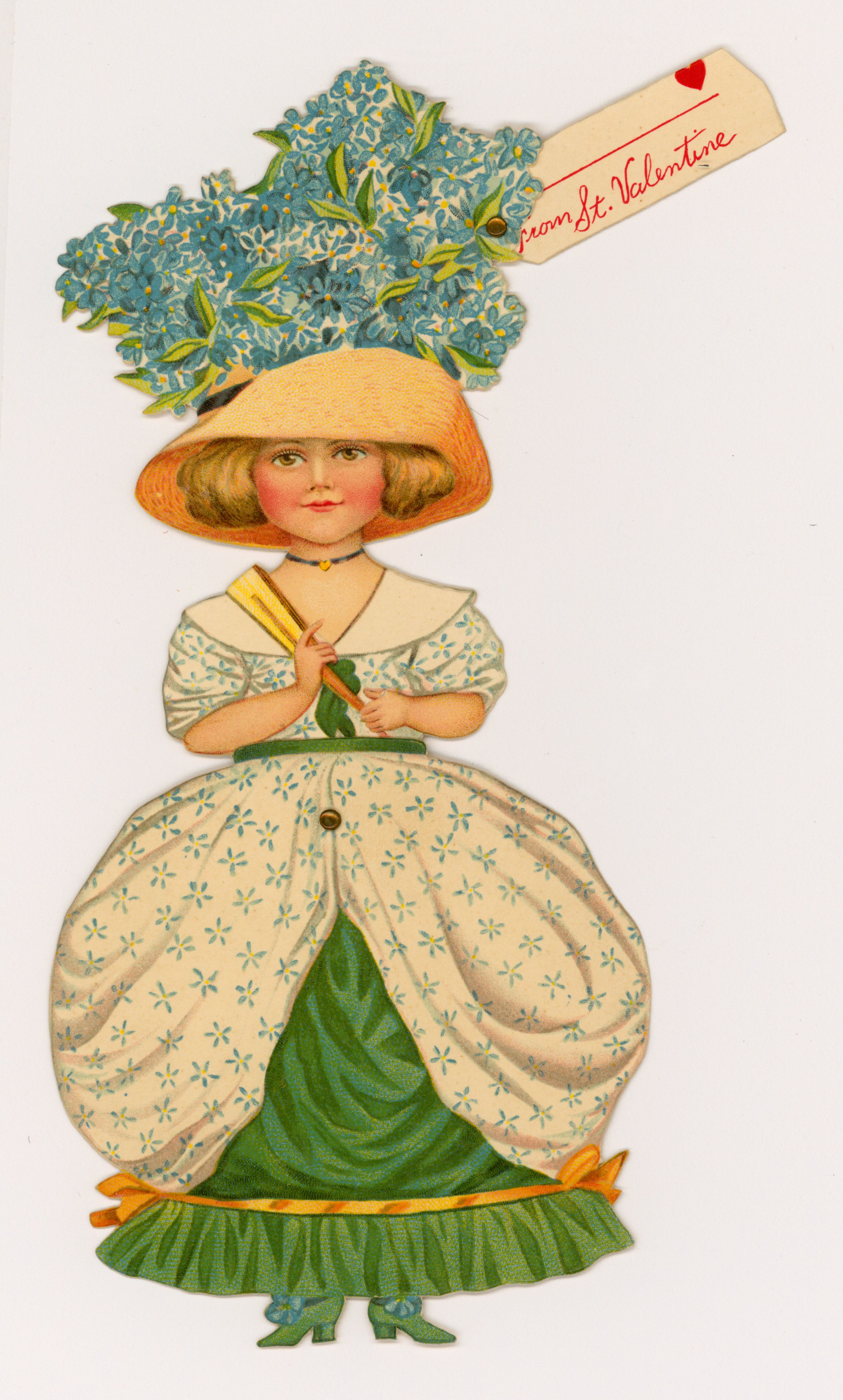 has a gift tag attached to her hat FOR____________ FROM ST. VALENTINE.