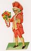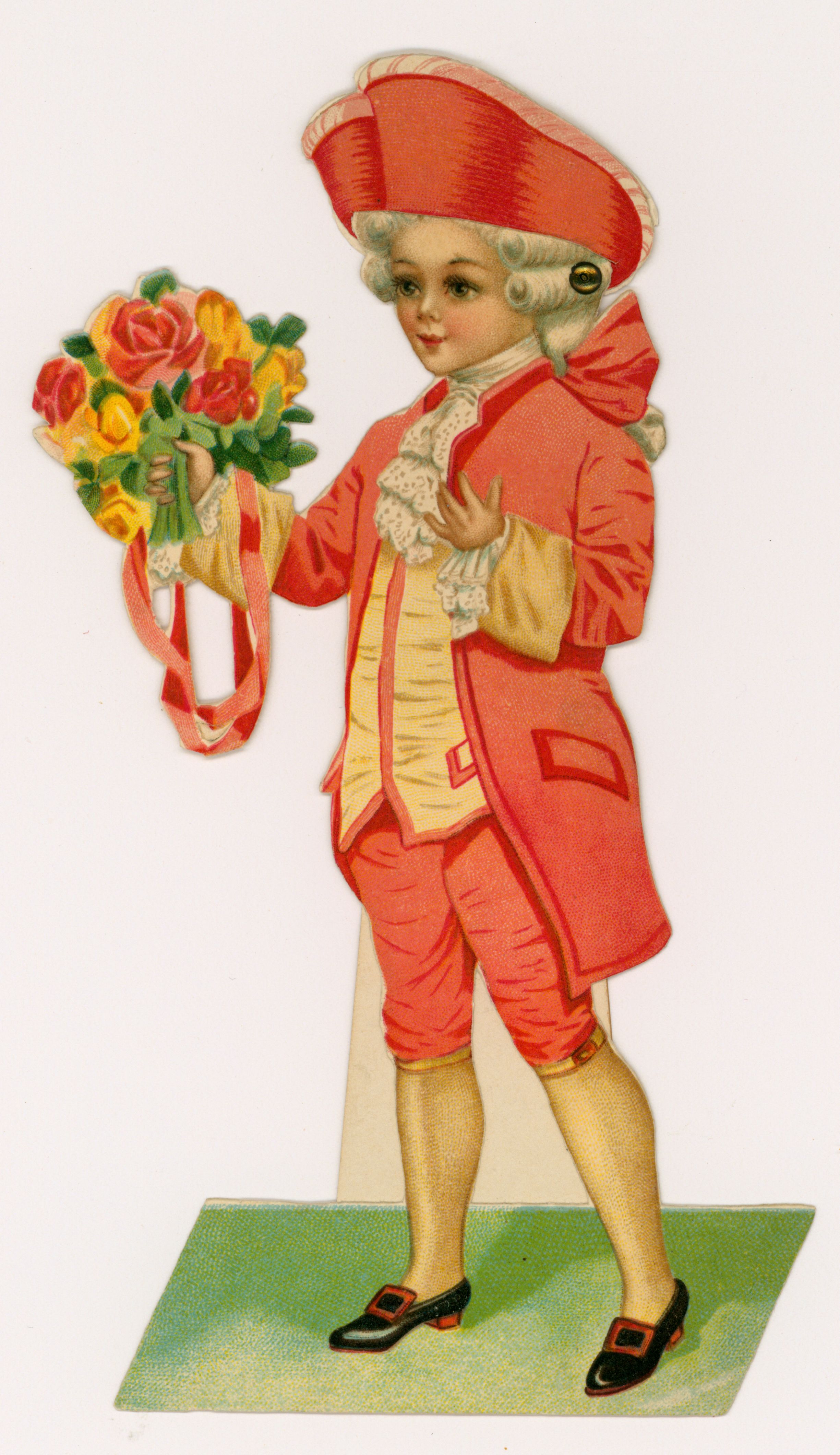Valentine, boy in pink colonial style dress hold out bouquet of flowers, hat moves