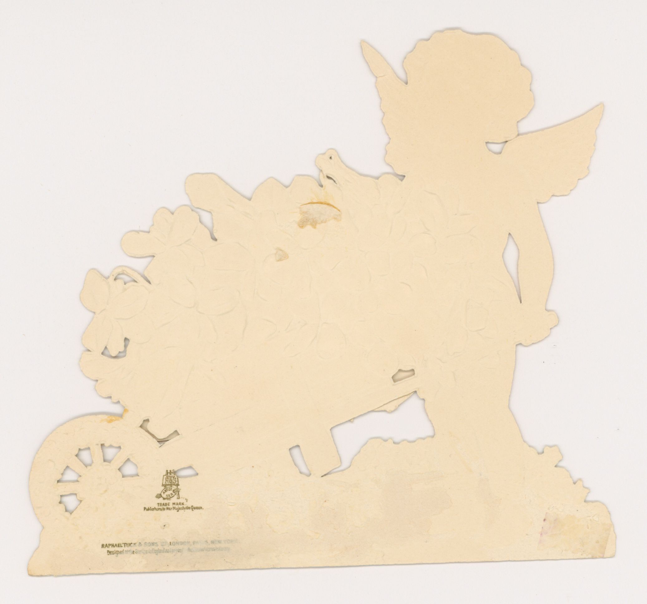LOVE LADEN, cupid pushes wheelbarrow of flowers, doves