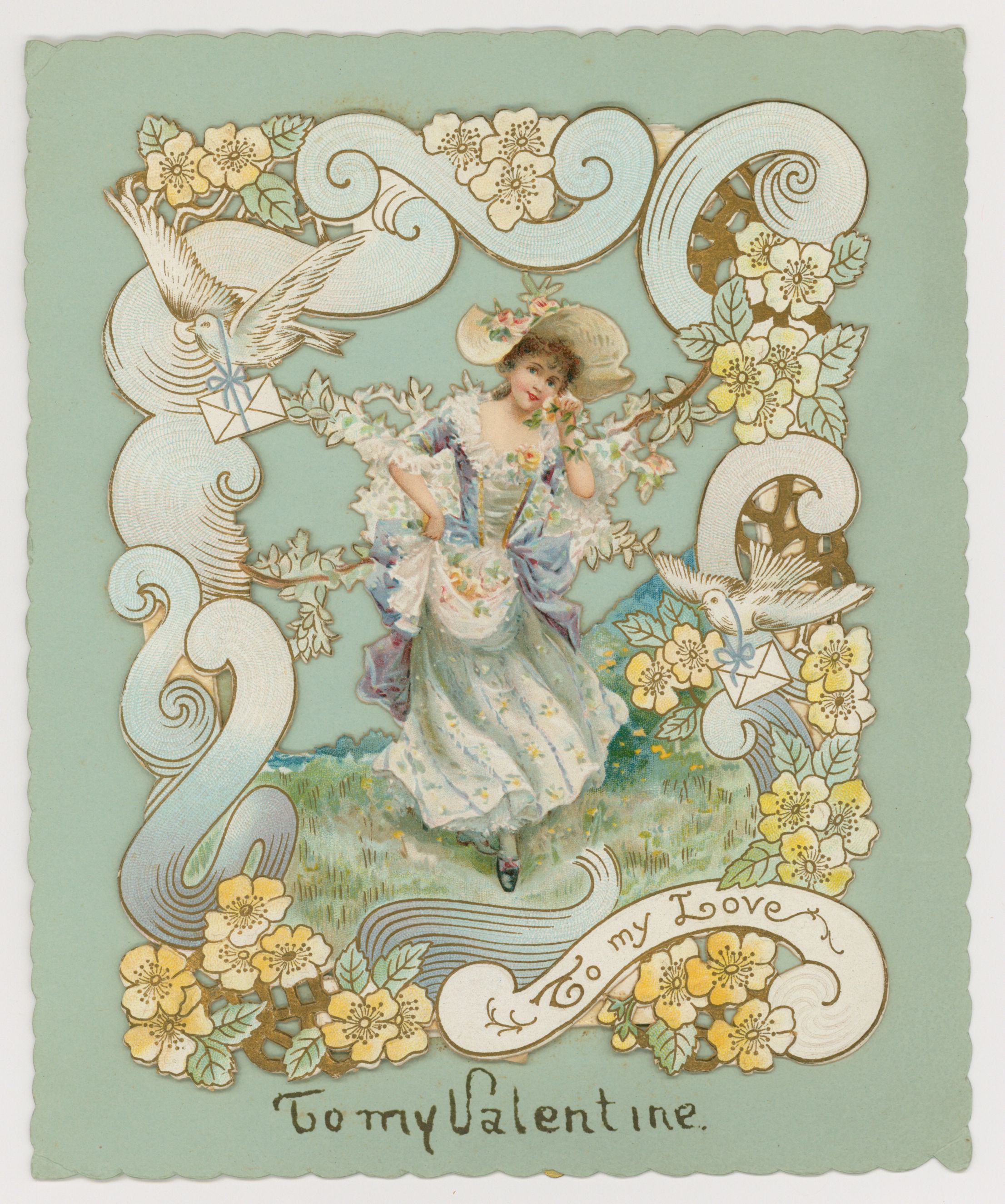 TO MY LOVE, TO MY VALENTINE, glamour girl, scroll design border with doves and flowers